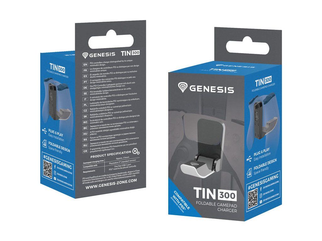 Seznamte se s GENESIS Tin 300 - nabíječkou kompatibilní se standardní verzí konzole PS5, s níž můžete snadno doplnit energii do gamepadů DualSense a DualSense Edge. Jednoduchá, plně skládací konstrukce, kvalitní materiály a nadčasový design - buďte kdykoli připraveni hrát.