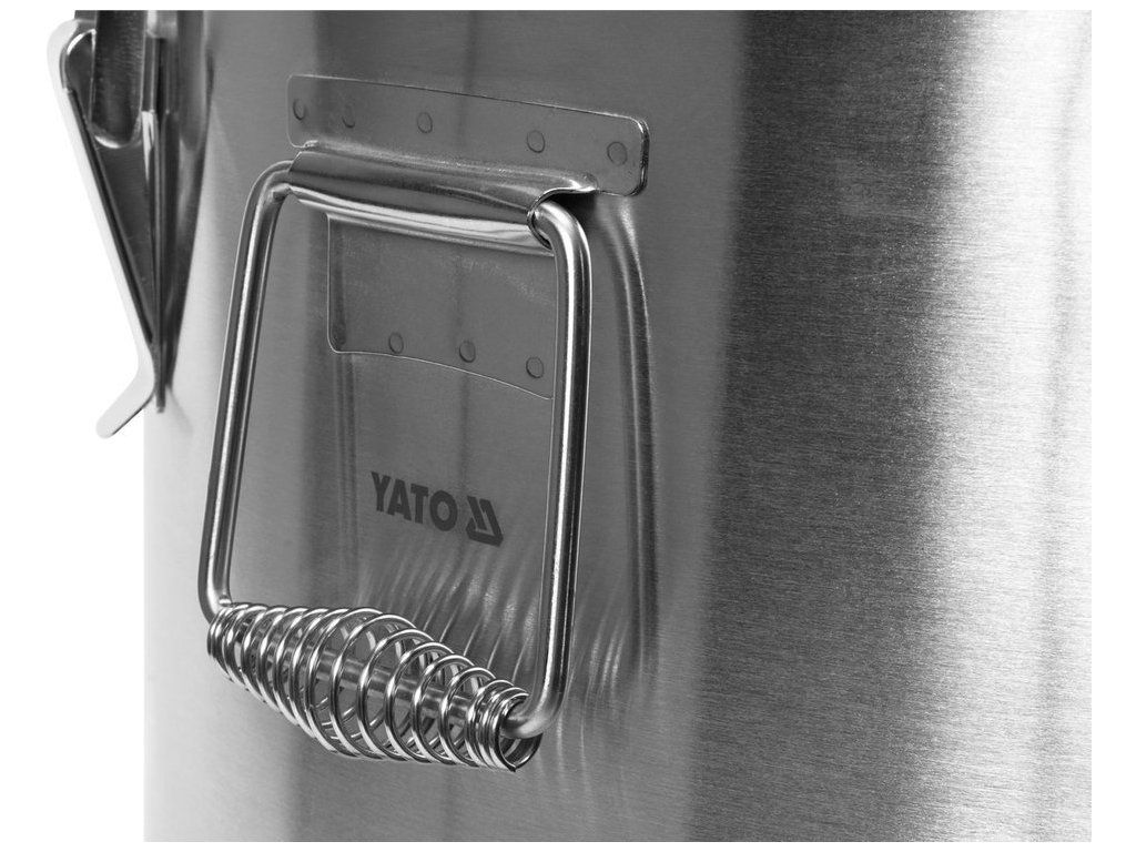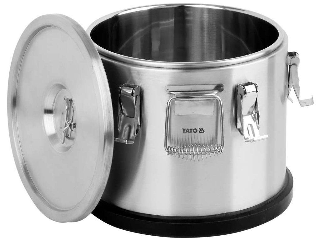 Termos je vybaven dvěmi masivními držadly z nerezové oceli pro snadný transport a šesti zápatkami uzavírající víko. Vysoká kvalita a odolnost těchto prvků zaručuje mnoho let bezproblémového používání. Dno termosu YATO je chráněno gumovým krytem, který zabraňuje sklouznutí po zemi během přepravy.