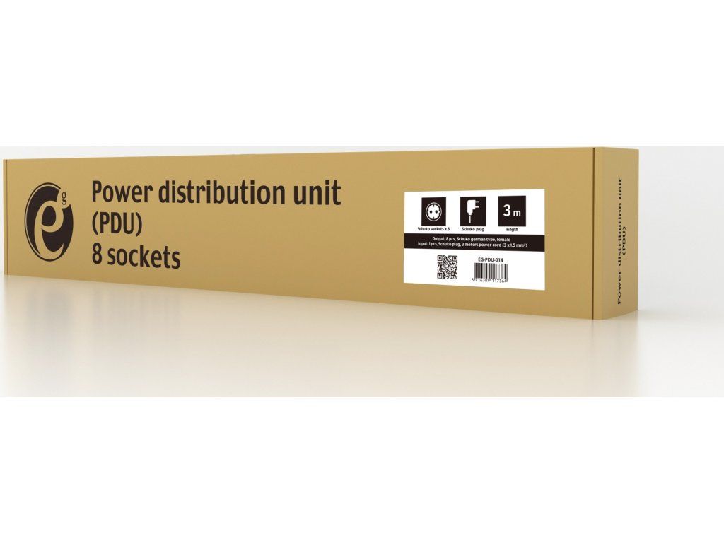 Gembird EG-PDU-014Rozvodný panel s osmi Schuko zásuvkami a hliníkovým tělem je určený pro montáž do racku. Maximální proud 16 A, výstupní výkon až 3680 W. Kabel je dlouhý 3 m a zakončený univerzální zástrčkou CEE7/7.