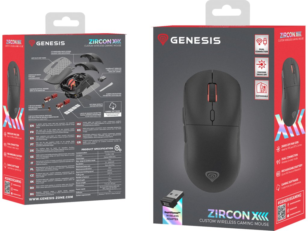 Seznamte se s jednou z nejpokročilejších myší na trhu. Představujeme vám GENESIS Zircon XIII s konstrukcí nabízející vše, co skutečně potřebujete. Plné přizpůsobení hardwaru (vyměnitelné spínače, vzdálenosti, pružiny), jeden z nejlepších snímačů na světě(Pixart PAW3395) a technologie bezdrátového připojení(RapidSpeed™ Wireless) pro skutečně drátový výkon, a to není vše. S GENESIS Zircon XIII hra teprve začíná.