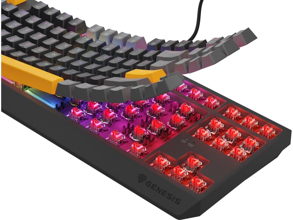 Klávesnici Genesis Thor 230 TKL jsme vybavili lineárními spínači Outemu Red, které vynikají vysokou přesností, aktivací bez ohledu na místo stisknutí klávesy a vysokou dynamikou. Víme však, že jako hráč můžete mít své vlastní preference. Proto jsme do Genesis Thor 230 TKL implementovali Hot Swap - techniku, která vám umožní nahradit jakýkoli třípinový mechanismus mikrospínačem od společností jako Outemu, Akko, KTT. Jednoduše vytáhněte nainstalovaný mechanismus a zapojte nový. Díky systému Hot Swap také nemusíte kupovat novou klávesnici, když jeden spínač selže. Vyměníte jej během několika sekund. Je to jednoduché.