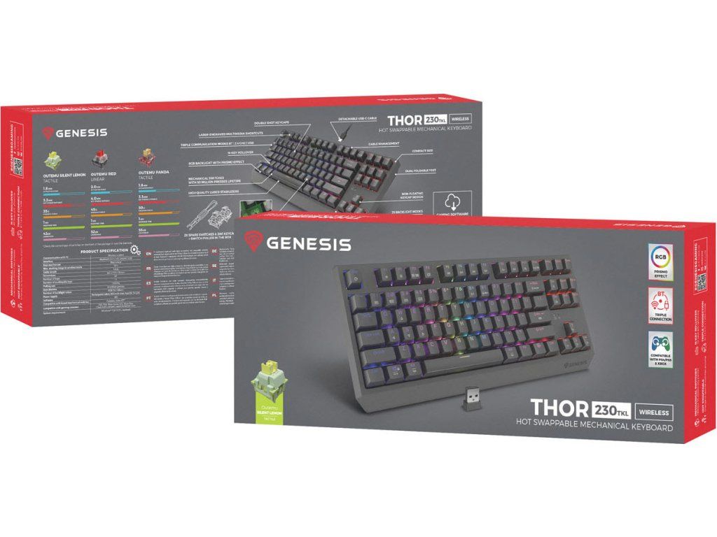 Klávesnice GENESIS Thor 230 TKL Wireless je vybavena různými typy spínačů. Každý z nich se vyznačuje vysokou přesností, aktivací bez ohledu na místo stisknutí klávesy a vysokou dynamikou. Víme však, že jako hráč můžete mít své vlastní preference. Proto jsme v GENESIS Thor 230 TKL Wireless implementovali hot - swap - techniku, která vám umožní vyměnit jakýkoli třípinový mechanismus za mikrospínač od společností jako Outemu, Akko, KTT. Jednoduše vytáhněte nainstalovaný mechanismus a zapojte nový. Díky systému Hot Swap také nemusíte kupovat novou klávesnici, když jeden spínač selže. Můžete jej vyměnit během několika sekund.