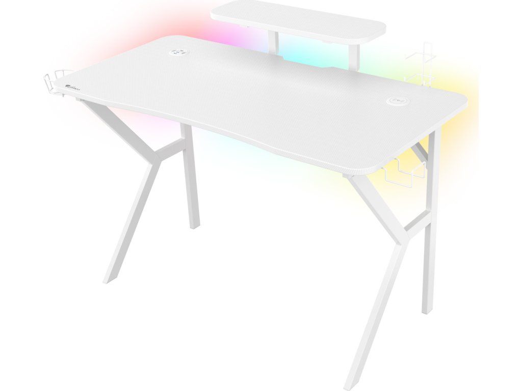 Každý prvek stolu je vyroben v bílé barvě. Karbonová povrchová úprava desky stolu v kombinaci s fenomenálním RGB podsvícením vám umožní vytvořit jedinečnou herní stanici. Přiložený dálkový ovladač vám umožní ovládat četné režimy a efekty podle vašich preferencí.
