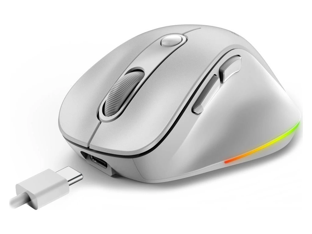 Ergonomická bezdrátová myš v kompaktním provedení disponuje optickým senzorem s nastavitelným rozlišením až 2400 DPI. Připojení k počítači je realizováno bezdrátově skrze Bluetooth nebo miniaturní USB přijímač a rozhraní 2,4 GHz. Myš se dokáže připojit až ke 3 zařízením zároveň, mezi nimi pak můžete přepínat stiskem jediného tlačítka (Dual BT režim + 2,4 GHz). USB přijímač lze pro snadné přenášení uschovat v těle myši. Napájení zajišťuje vestavěná dobíjecí baterie s kapacitou 500 mAh, kterou lze nabíjet pomocí USB-C portu. Potěší také stylové sedmibarevné podsvícení.