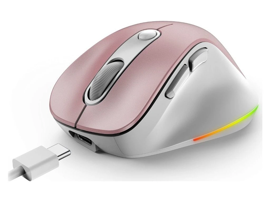 Ergonomická bezdrátová myš v kompaktním provedení disponuje optickým senzorem s nastavitelným rozlišením až 2400 DPI. Připojení k počítači je realizováno bezdrátově skrze Bluetooth nebo miniaturní USB přijímač a rozhraní 2,4 GHz. Myš se dokáže připojit až ke 3 zařízením zároveň, mezi nimi pak můžete přepínat stiskem jediného tlačítka (Dual BT režim + 2,4 GHz). USB přijímač lze pro snadné přenášení uschovat v těle myši. Napájení zajišťuje vestavěná dobíjecí baterie s kapacitou 500 mAh, kterou lze nabíjet pomocí USB-C portu. Potěší také stylové sedmibarevné podsvícení.