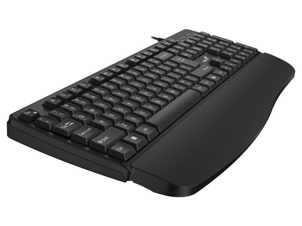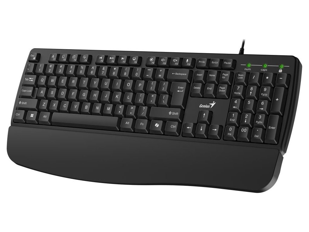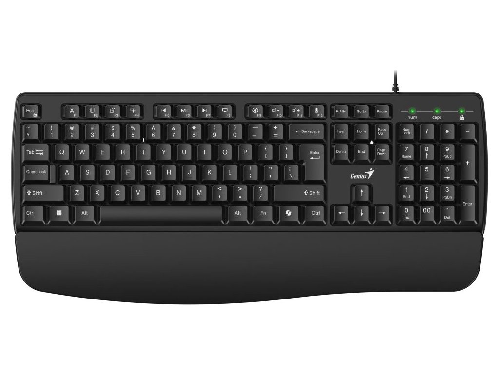 Genius KB-123 je kancelářská klávesnice s ergonomickou opěrkou zápěstí, která podporuje předloktí a snižuje namáhání zápěstí pro pohodlnější a zdravější psaní. Tento model je vybaven speciální klávesou pro aktivaci AI asistenta Copilot (pro Windows 11 a novější) a nabízí řadu praktických zkratkových kláves pro zvýšení produktivity.