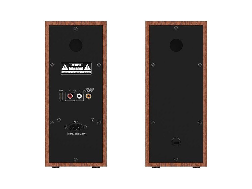 Sada reproduktorů s v konfiguraci 2.0 s celkovým výkonem 20 W. Vyrobeny jsou ze dřeva pro docílení toho nejlepšího zvuku s plnými basy i zřetelnými výškami. Připojení k počítači, notebooku či chytrému telefonu lze jednoduše realizovat drátově skrze audio vstup, nebo bezdrátově pomocí Bluetooth. K dispozici je také sluchátkový výstup a USB vstup. Ovládání hlasitosti a tónů je umístěno přímo na reproduktoru.