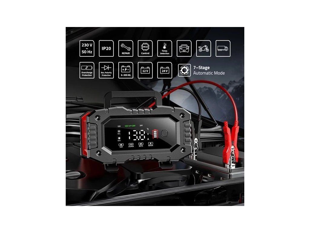 - Celkem 7 režimů nabíjení: 12V AGM + (LiFePO4), 24V AGM + (LiFePO4), 12V auto, 24V auto, 12V motorka, 24V motorka, režim obnovy