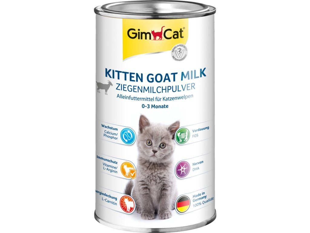 Sušené kozí mléko GimCat bylo vyvinuto pro odchov koťat bez matky tak, aby poskytovalo koťatům všechny základní živiny, které získávají přirozeně z mateřského mléka. Vhodné také pro přikrmování koťat nebo březích a kojících koček. Mléko má vysoký obsah vápníku a fosforu pro růst a vývoj kostí, s obsahem probiotik, FOS a oligosacharidů pro podporu zažívání, obsahuje všechny potřebné vitaminy, minerály a stopové prvky. Je zdrojem taurinu pro normální vývoj srdce a zraku, a Omega 3 pro rozvoj nervového systému. Mléko je navíc obohaceno o L-karnitin pro energetické nároky malých koťat. Sušené kozí mléko je způsob, jak zajistit co nejlepší start do života i koťátkům, o které se nemůže postarat jejich maminka.