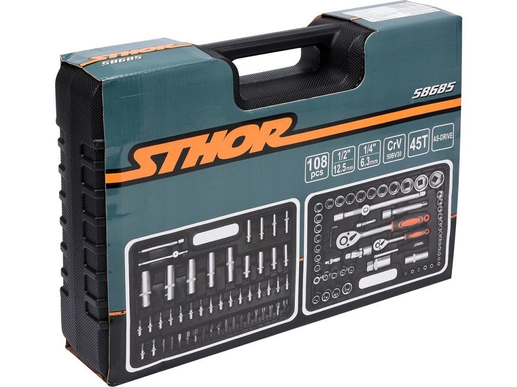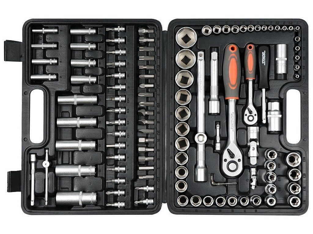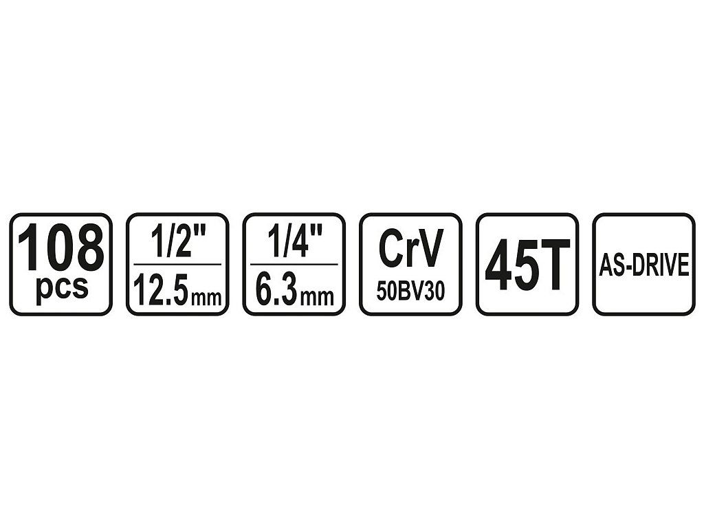 Sada obsahuje dvě ráčny, celou řadu bitů, adaptérů, nástavců 1/2"a 1/4" vše uspořádáno v přehledných pozicích.