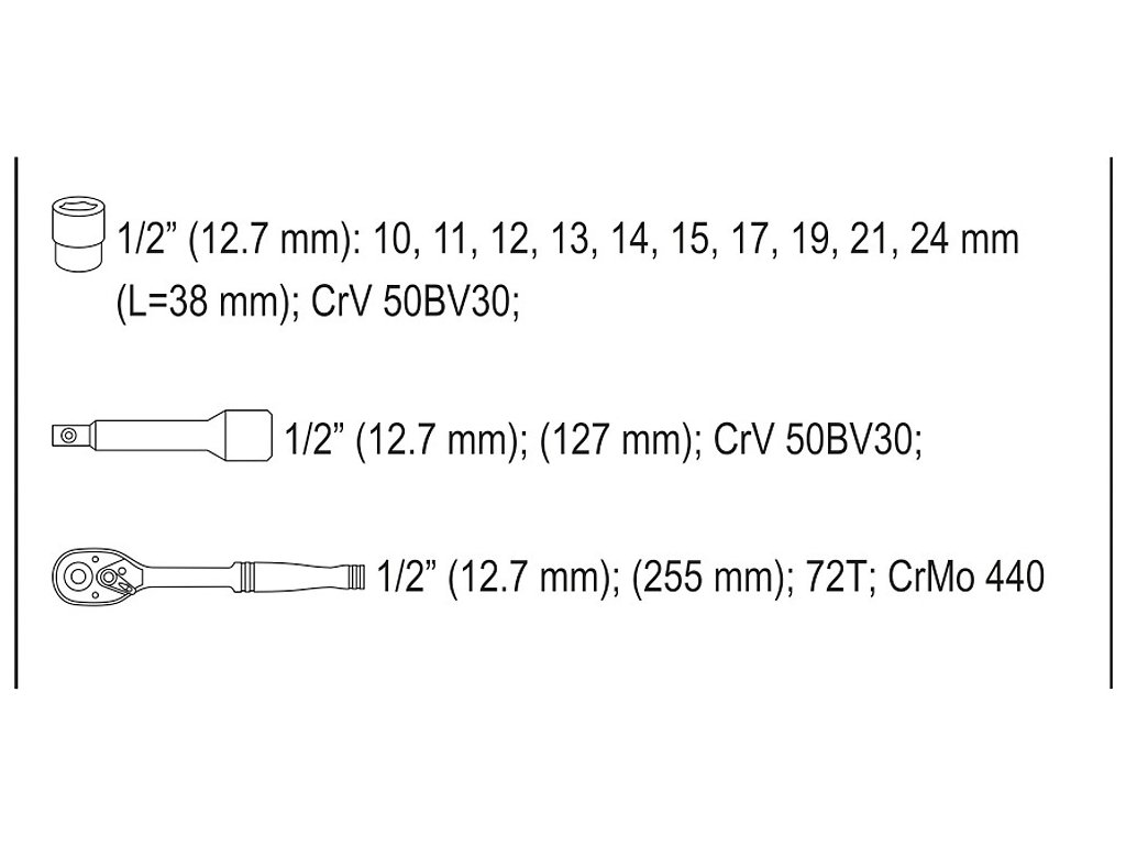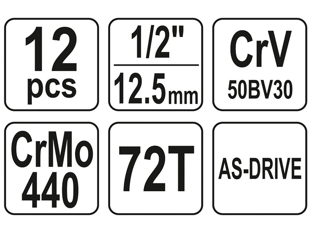 Gola sada 1/2" obsahuje 12ks: nástavců, prodlužovací nástavec a ráčnu s plastovou rukojetí. Vyrobené z kvalitní chromvanadiové oceli CrV6140 a CrV50BV30, S2 s funkcí AS-DRIVE.