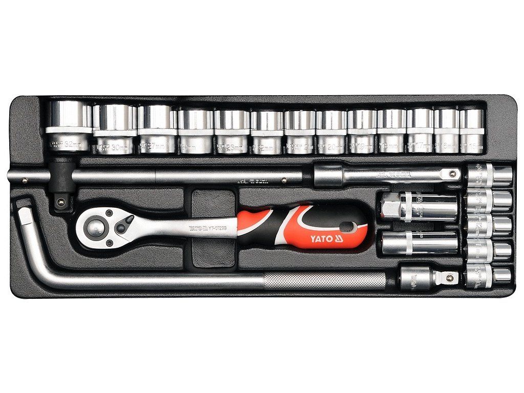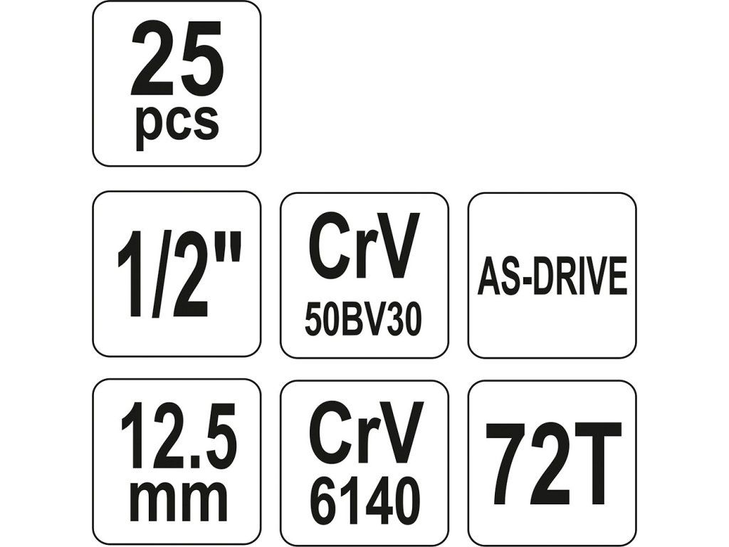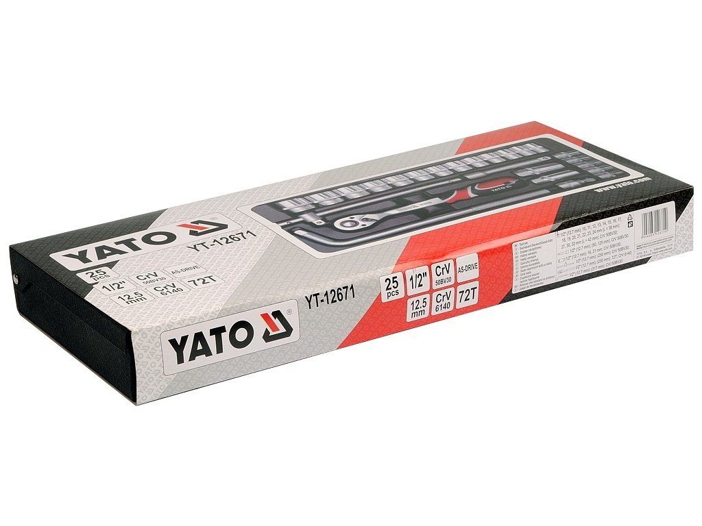 Gola sada 1/2" obsahuje 25ks: nástavců, prodlužovacích nástavců, ráčnu s plastovou rukojetí a další příslušenství. Vyrobené z kvalitní chromvanadiové oceli CrV6140 a CrV50BV30 s funkcí AS-DRIVE. Ráčna má jemný 72 zubý chod.