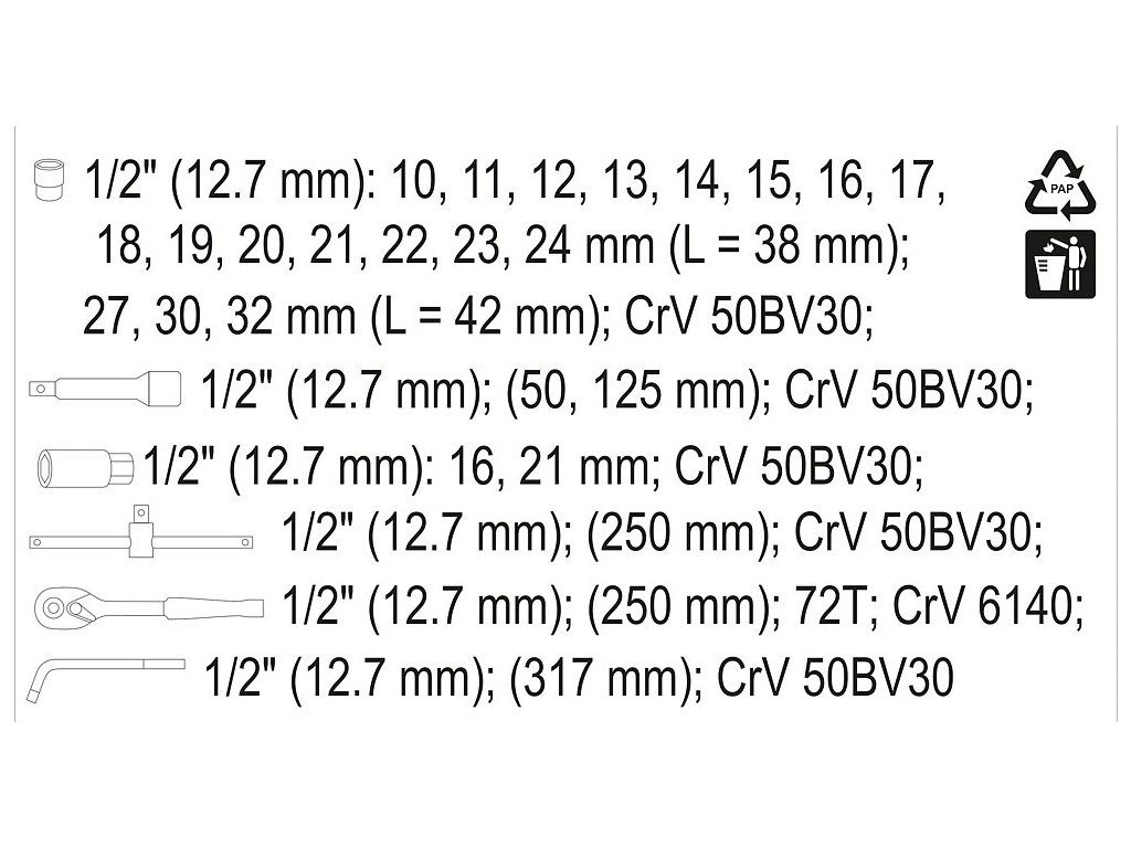 | 15x | nástavec 1/2": 10; 11; 12; 13; 14; 15; 16; 17; 18; 19; 20; 21; 22; 23; 24 mm (38 mm) |