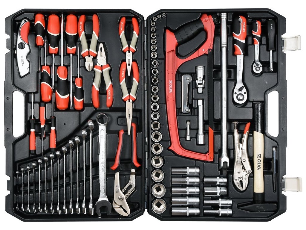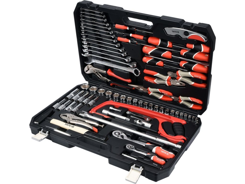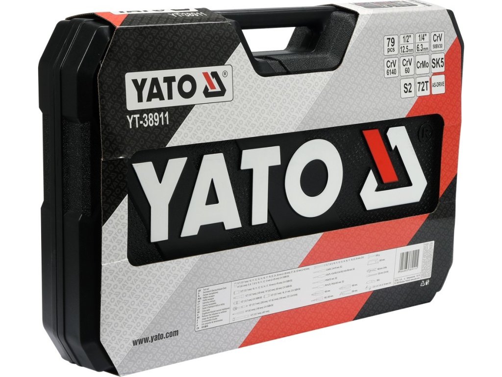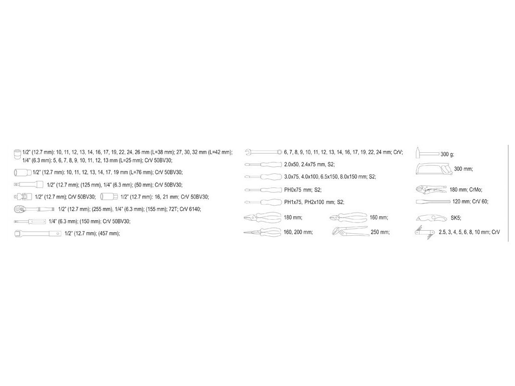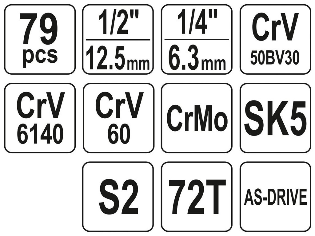 Gola sada 1/2", 1/4" obsahuje 79ks: nástavců, prodlužovacích nástavců, ráčny s plastovou rukojetí, kloubové nástavce očkoploché klíče, kleště, kladivo a další příslušenství. Vyrobené z kvalitní chromvanadiové a chrommolybdenové oceli CrV6140, CrV50BV30, CrV60, CrMo a S2 s funkcí AS-DRIVE.