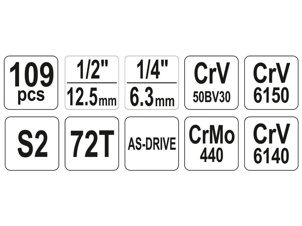 Gola sada 1/2", 3/8", 1/4" obsahuje 109ks: metrických nástavců, prodlužovacích nástavců, ráčny s plastovou rukojetí a 72 zubým jemným chodem, kloubové nástavce, očkoploché klíče, ráčnové klíče, trubkové klíče, kleště šroubováky, kladivo, nástavce s nejběžněji používanými bity a další příslušenství. Vyrobené z kvalitní chromvanadiové oceli CrMo440, CrV6140, CrV6150 a CrV50BV30, S2 s funkcí AS-DRIVE.