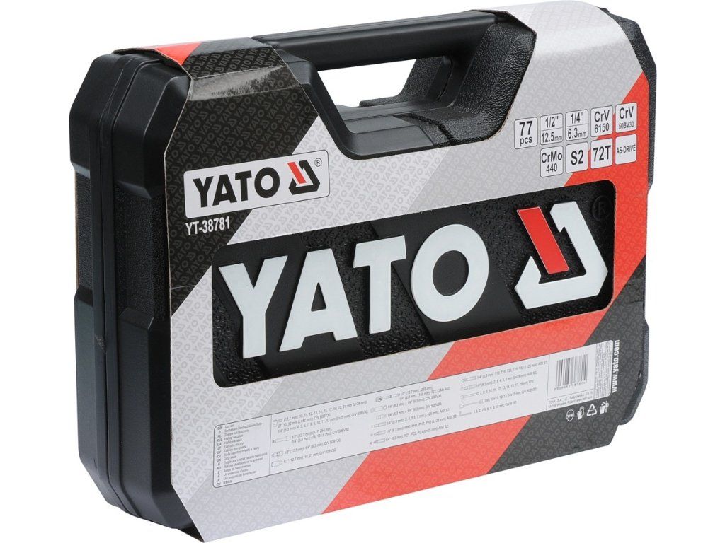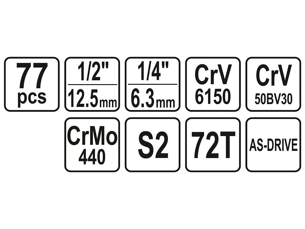 Gola sada 1/2", 1/4" obsahuje 77ks: nástavců, prodlužovacích nástavců, ráčny s plastovou rukojetí a 72 zubým jemným chodem, kloubové nástavce, očkoploché klíče, imbusové klíče a další příslušenství. Vyrobené z kvalitní chromvanadiové oceli CrMo440, CrV6150 a CrV50BV30, S2 s funkcí AS-DRIVE.