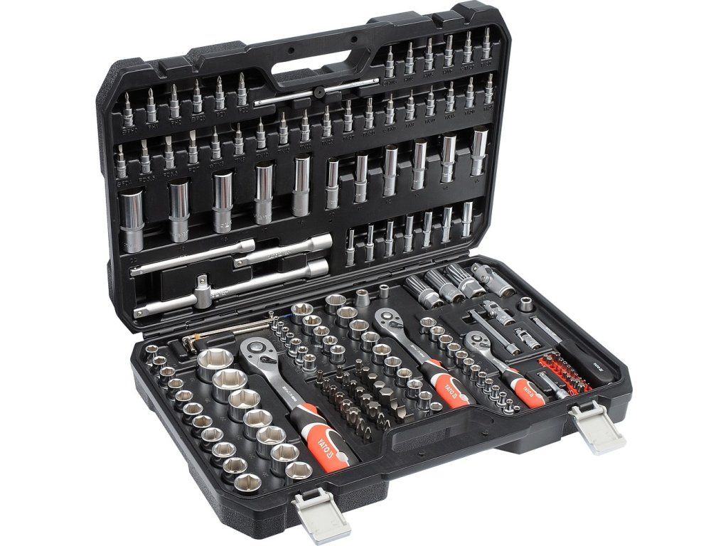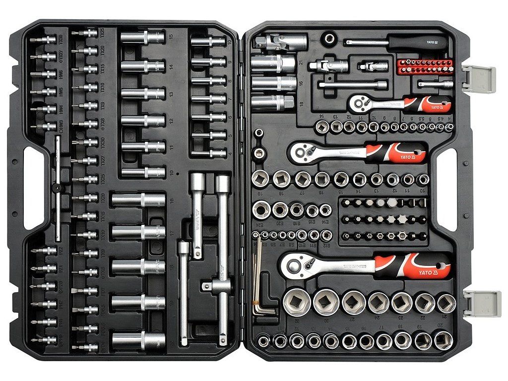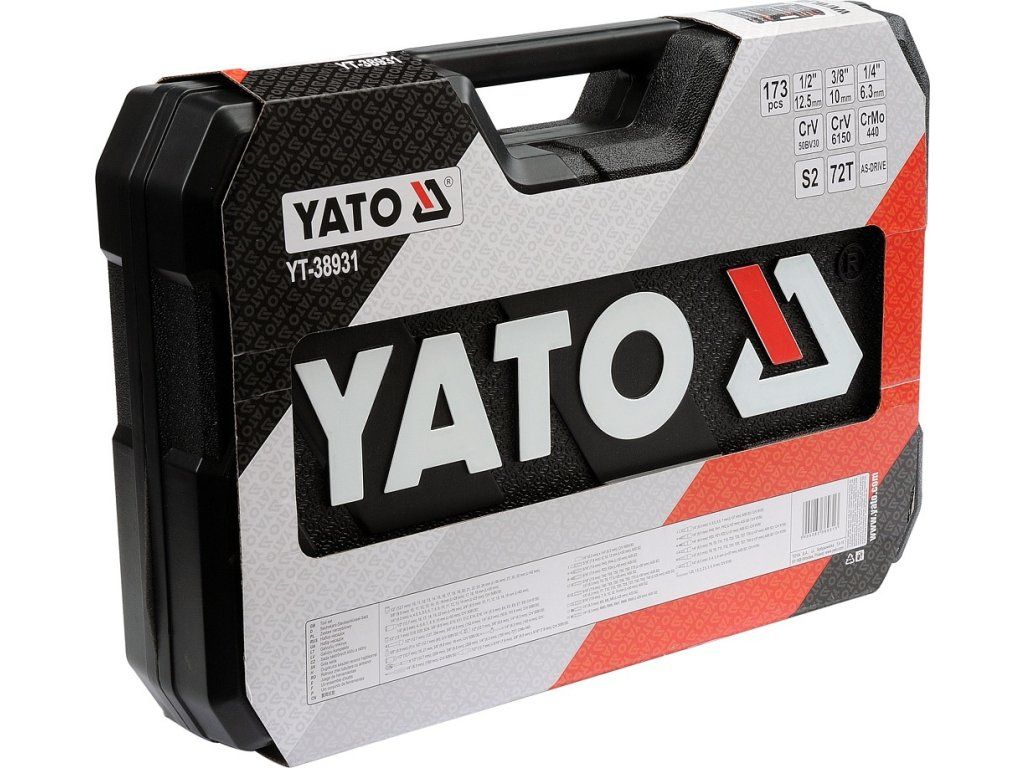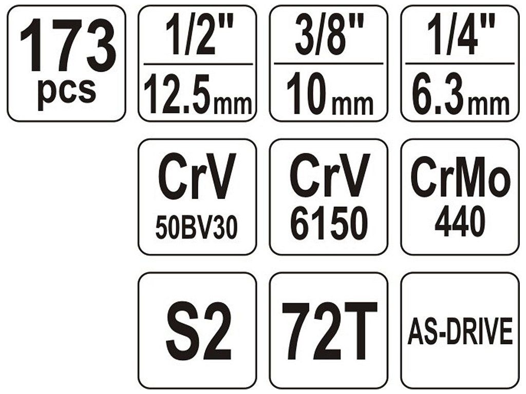 Gola sada 1/2", 3/8", 1/4" obsahuje 173ks: nástavců, prodlužovacích nástavců, ráčny s plastovou rukojetí a 72 zubým jemným chodem, kloubové nástavce a další příslušenství. Vyrobené z kvalitní chromvanadiové oceli CrMo440, CrV6150 a CrV50BV30, S2 s funkcí AS-DRIVE.