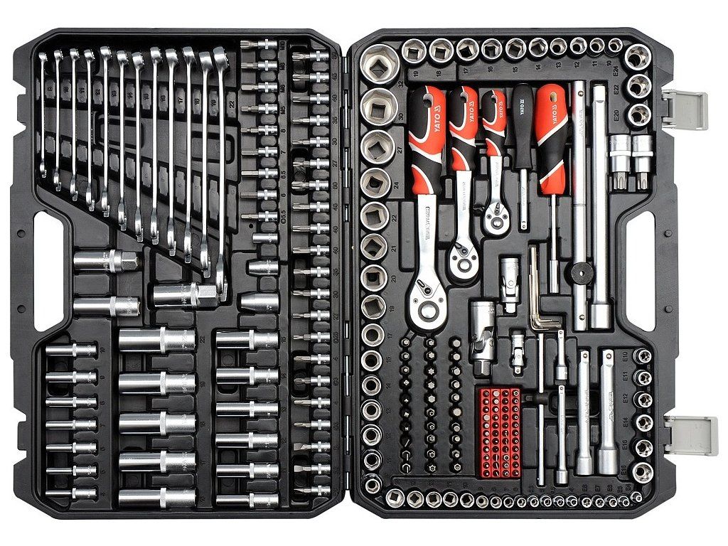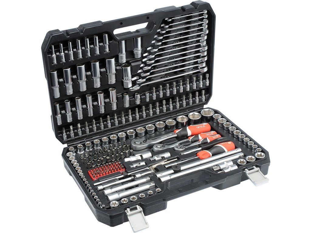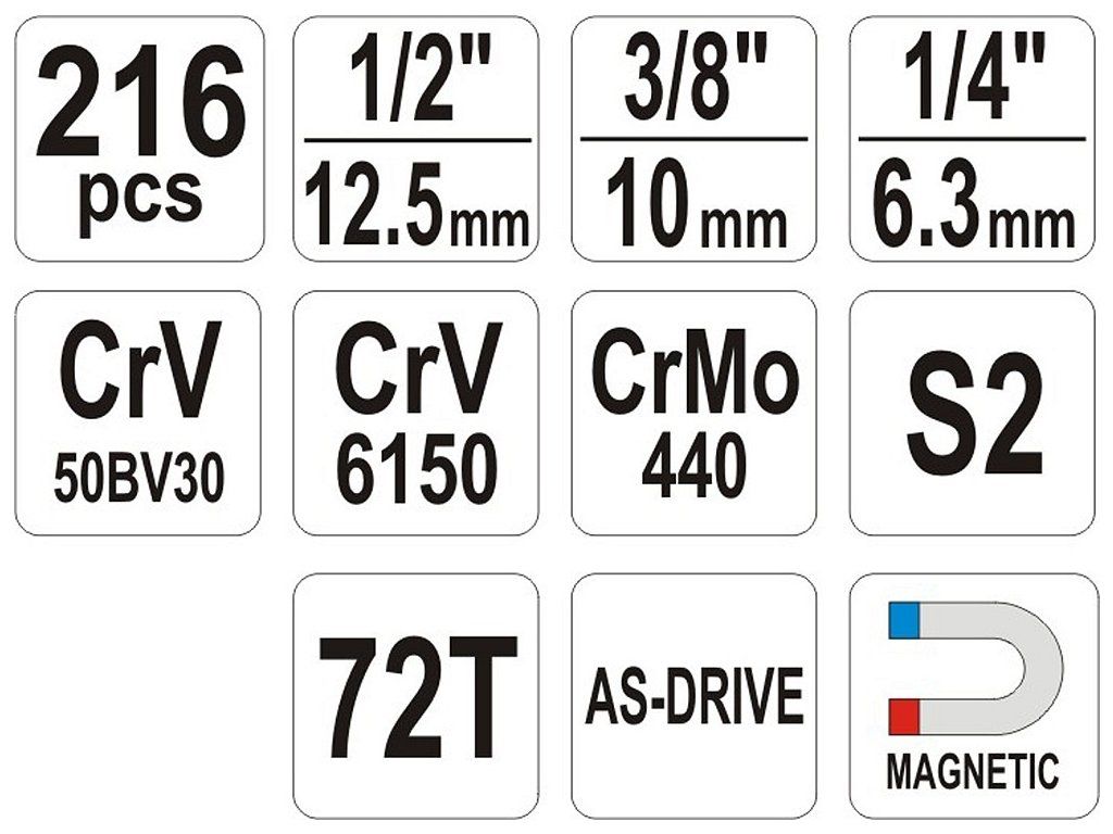 Gola sada 1/2", 3/8", 1/4" obsahuje 216ks: nástavců, prodlužovacích nástavců, ráčny s plastovou rukojetí, kloubové nástavce očkoploché klíče a další příslušenství. Vyrobené z kvalitní chromvanadiové oceli CrV6140 a CrV50BV30, S2 s funkcí AS-DRIVE.