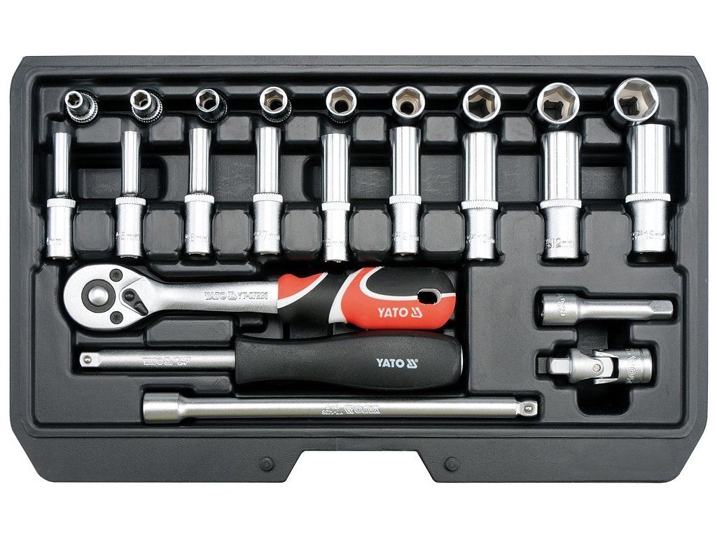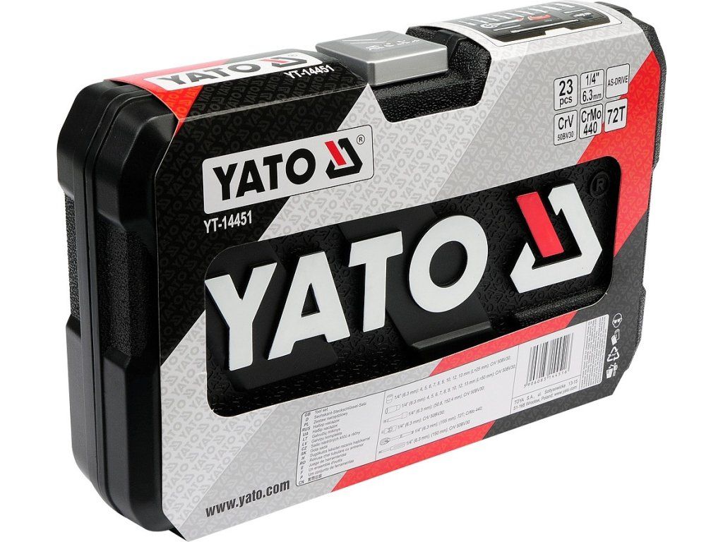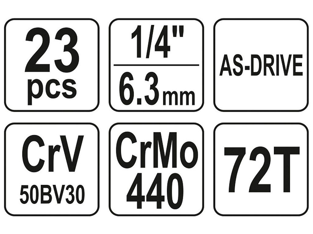 Gola sada 1/4" obsahuje 23ks: nástavců, prodlužovacích nástavců, ráčnu s plastovou rukojetí a další příslušenství. Vyrobené z kvalitní oceli CrV50BV30, CrMo440 s funkcí AS-DRIVE. Ráčna má jemný 72 zubý chod.