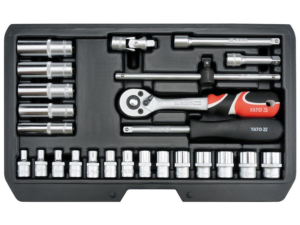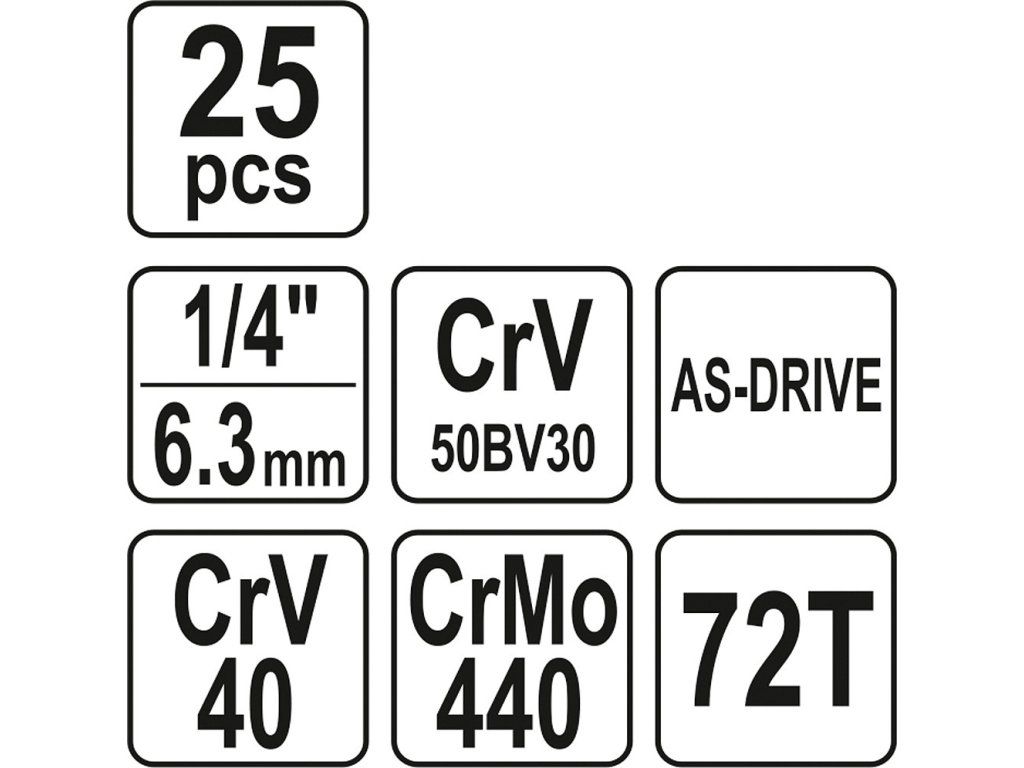 Gola sada 1/4" obsahuje 25ks: nástavců, prodlužovacích nástavců, ráčnu s plastovou rukojetí a další příslušenství. Vyrobené z kvalitní oceli CrV50BV30, CrV40, CrMo440 s funkcí AS-DRIVE. Ráčna má jemný 72 zubý chod.
