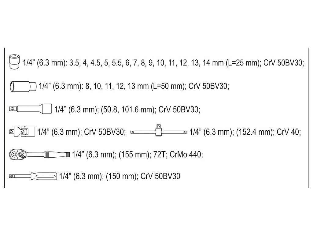 14x | nástavec 1/4": 3,5; 4; 4,5; 5; 5,5; 6; 7; 8; 9; 10; 11; 12; 13; 14 mm (25 mm) |