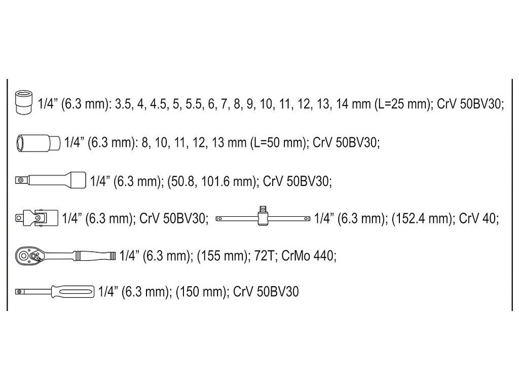| 14x | nástavec 1/4": 3,5; 4; 4,5; 5; 5,5; 6; 7; 8; 9; 10; 11; 12; 13; 14 mm (25 mm) |