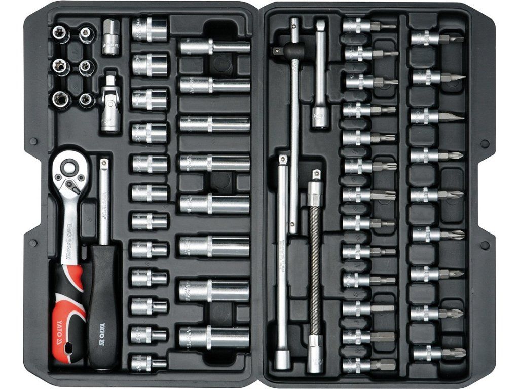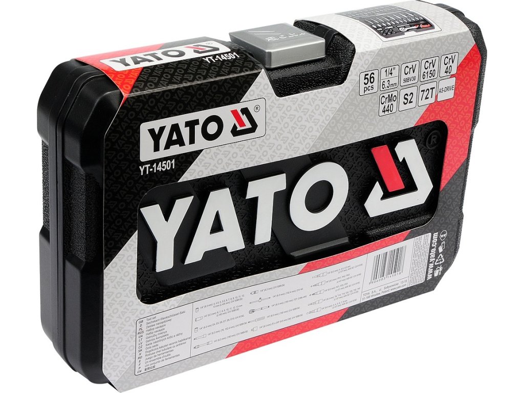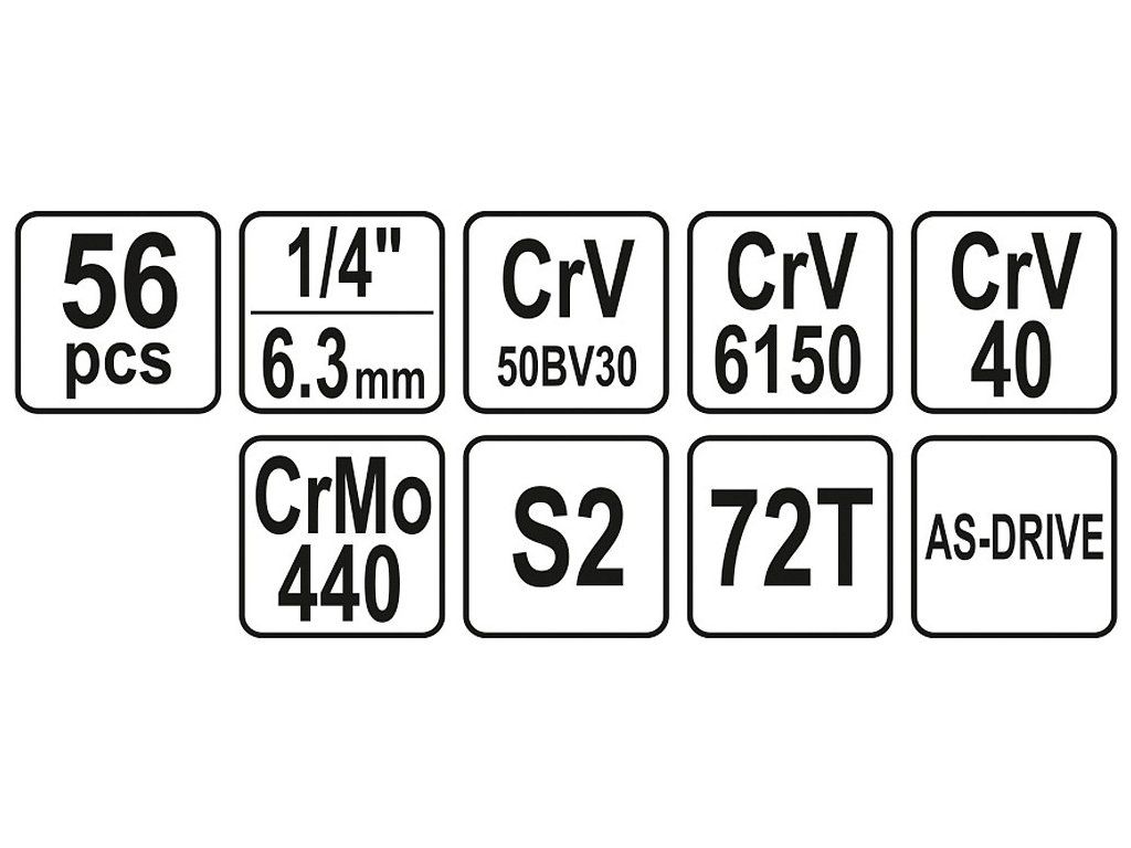 Gola sada 1/4" obsahuje 56ks: nástavců, prodlužovacích nástavců, ráčnu s plastovou rukojetí a další příslušenství. Vyrobené z kvalitní oceli CrV50BV30, CrV40, CrV6150, CrMo440 a S2 s funkcí AS-DRIVE. Ráčna má jemný 72 zubý chod.