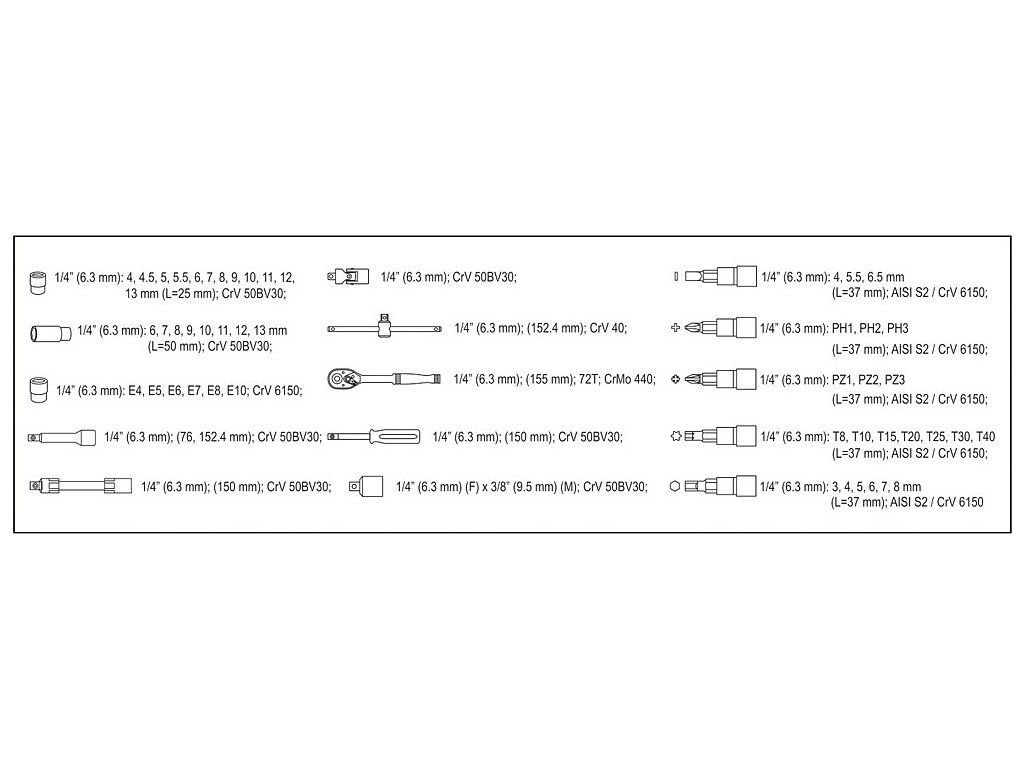 | 12x | nástavec 1/4": 4; 4.5; 5; 5.5; 6; 7; 8; 9; 10; 11; 12, 13 mm (L= 25 mm) |