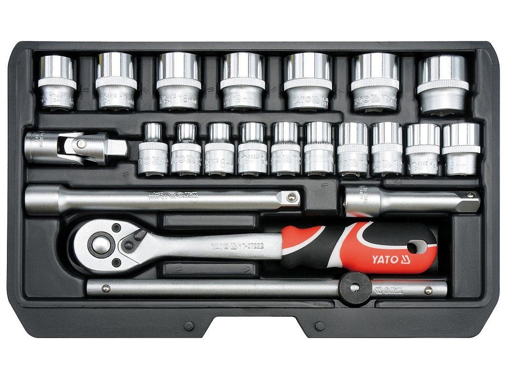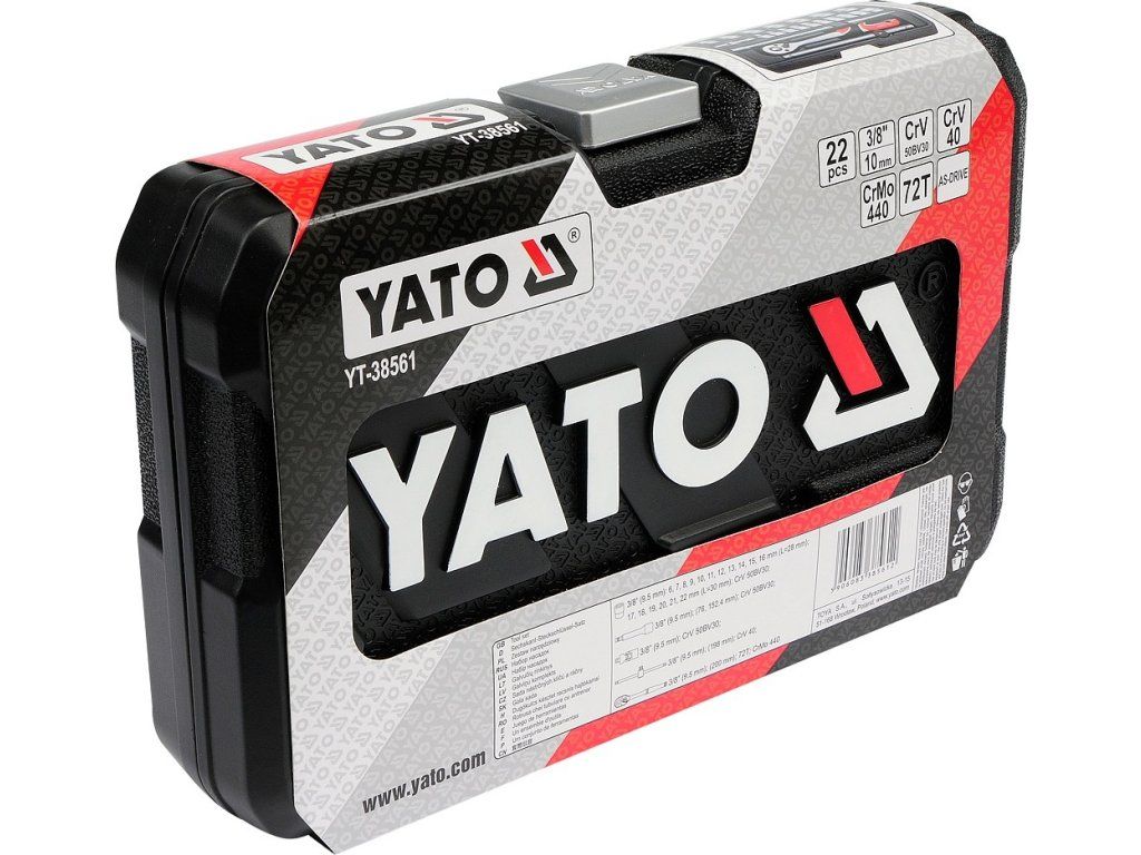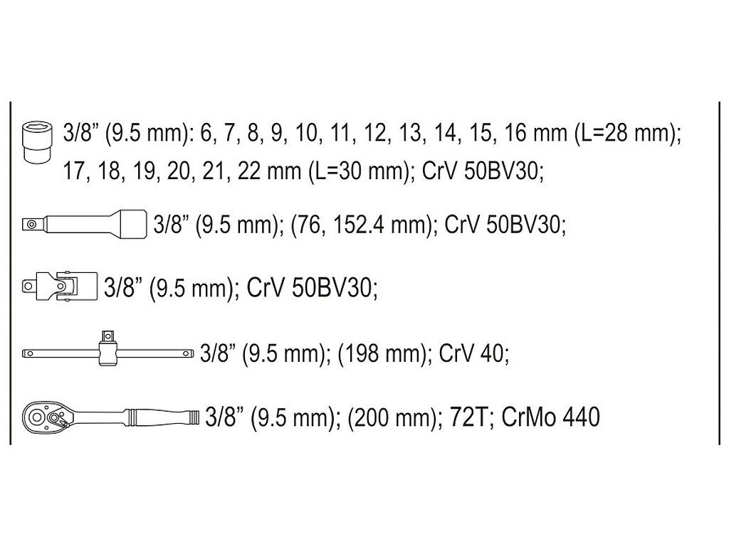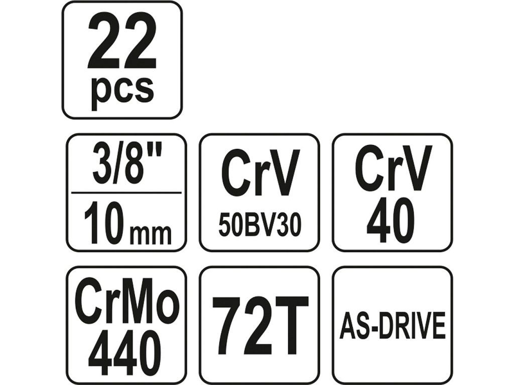 Gola sada 3/8" obsahuje 22 ks: nástavce, nástavce, kloubový nástavec, ráčnu s plastovou rukojetí a t-nosník. Vyrobeno z vysoce kvalitní chrom-vanadiové oceli CrV6140 a CrV50BV30, S2 s funkcí AS-DRIVE.