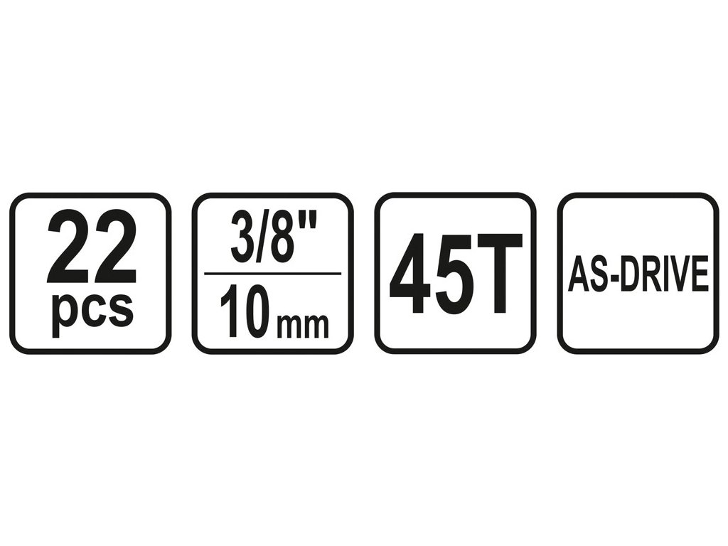 Obsah balení: nástavce 3/8": 6,7,8,9,10,11,12,13,14,15,16,17,18,19,20,21,22 mm prodlužovací nástavec 3/8": 2x ráčna 3/8" 45T: 1x kloubový nástavec 3/8": 1x t-vratidlo 3/8": 1xDoplňkové parametry