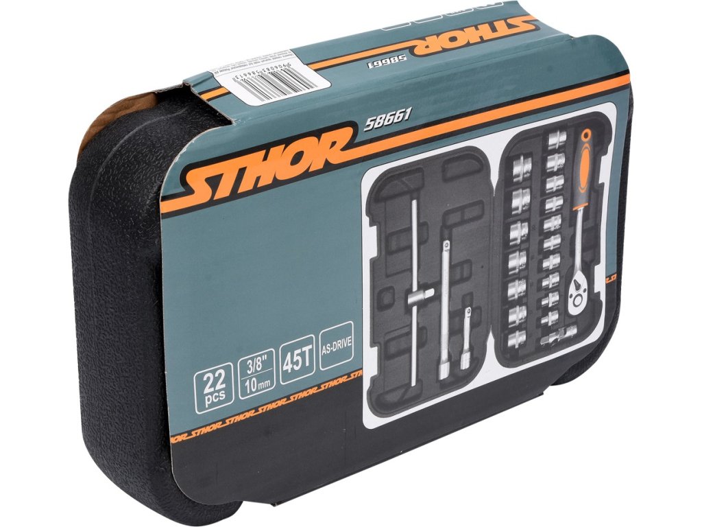 Sada obsahuje ráčnu s 45 zuby, prodlužovacích nástavců, celou řadu nástavců 3/8" a kloubového nástavce, vše je přehledně uspořádáno.