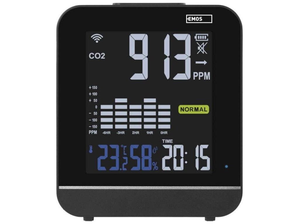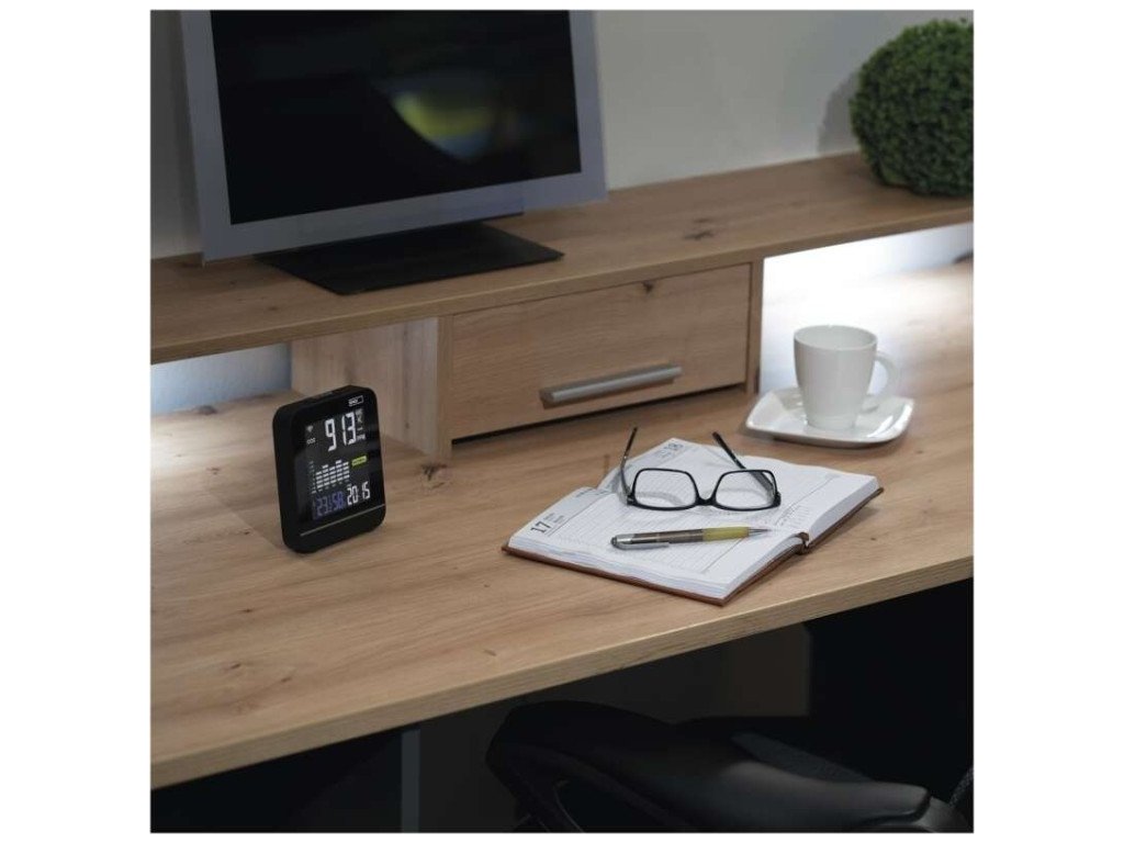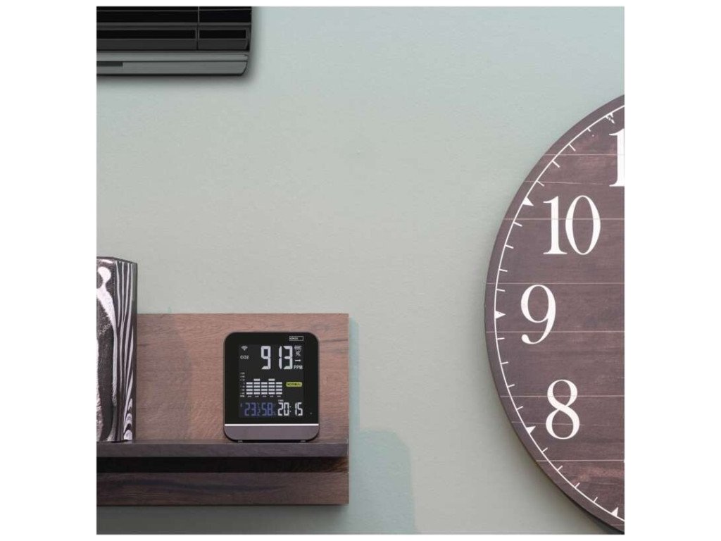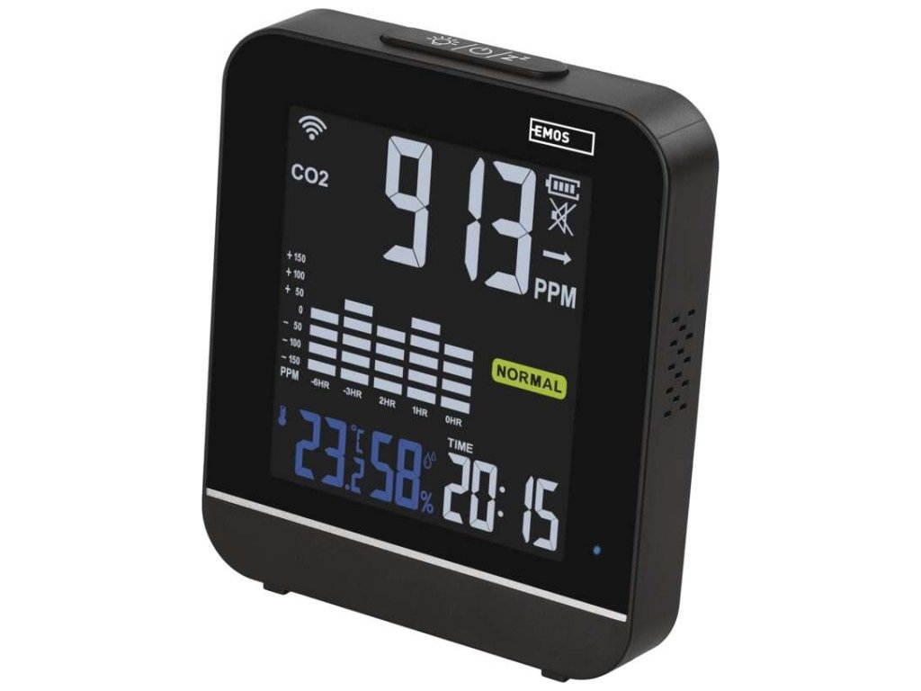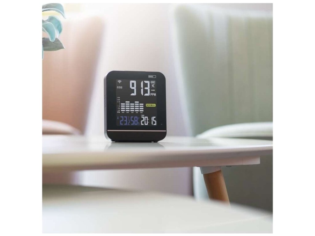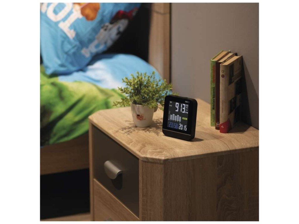 Monitor kvality ovzduší zobrazující hladinu CO2 v místnosti. Zobrazuje i teplotu a vlhkost.