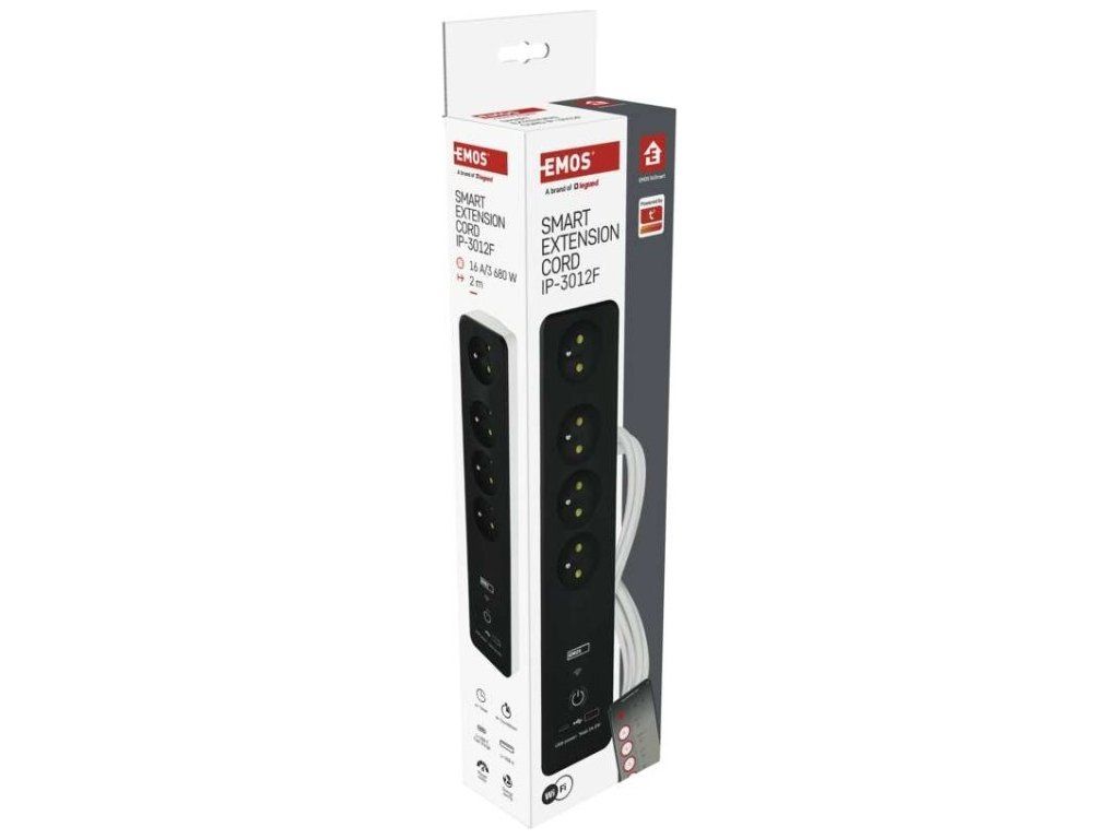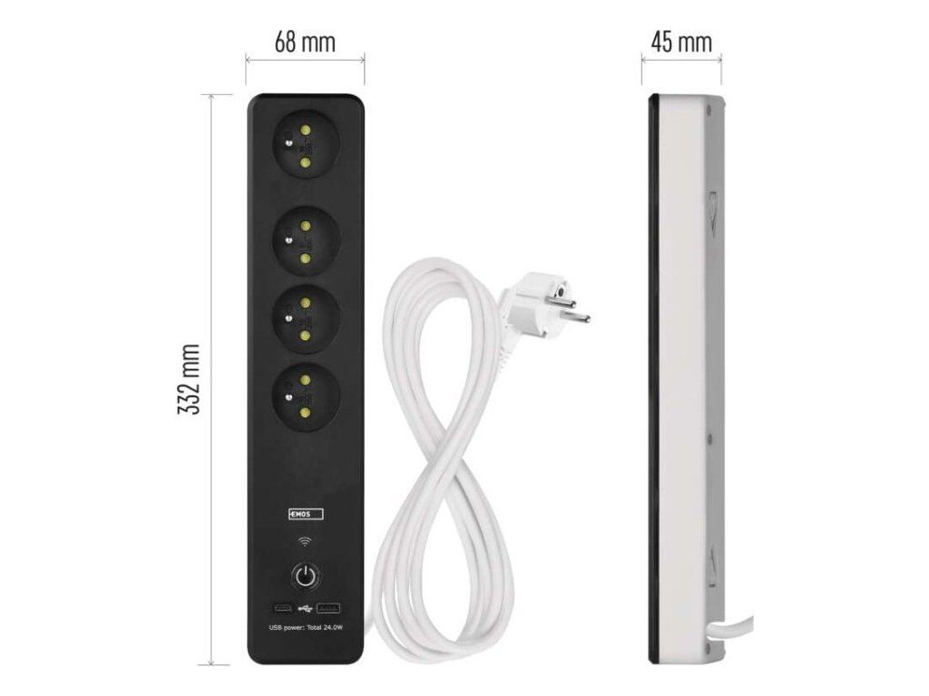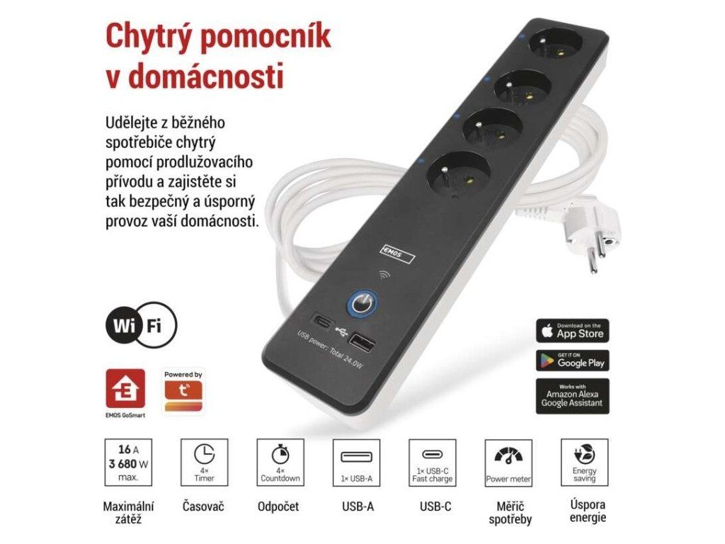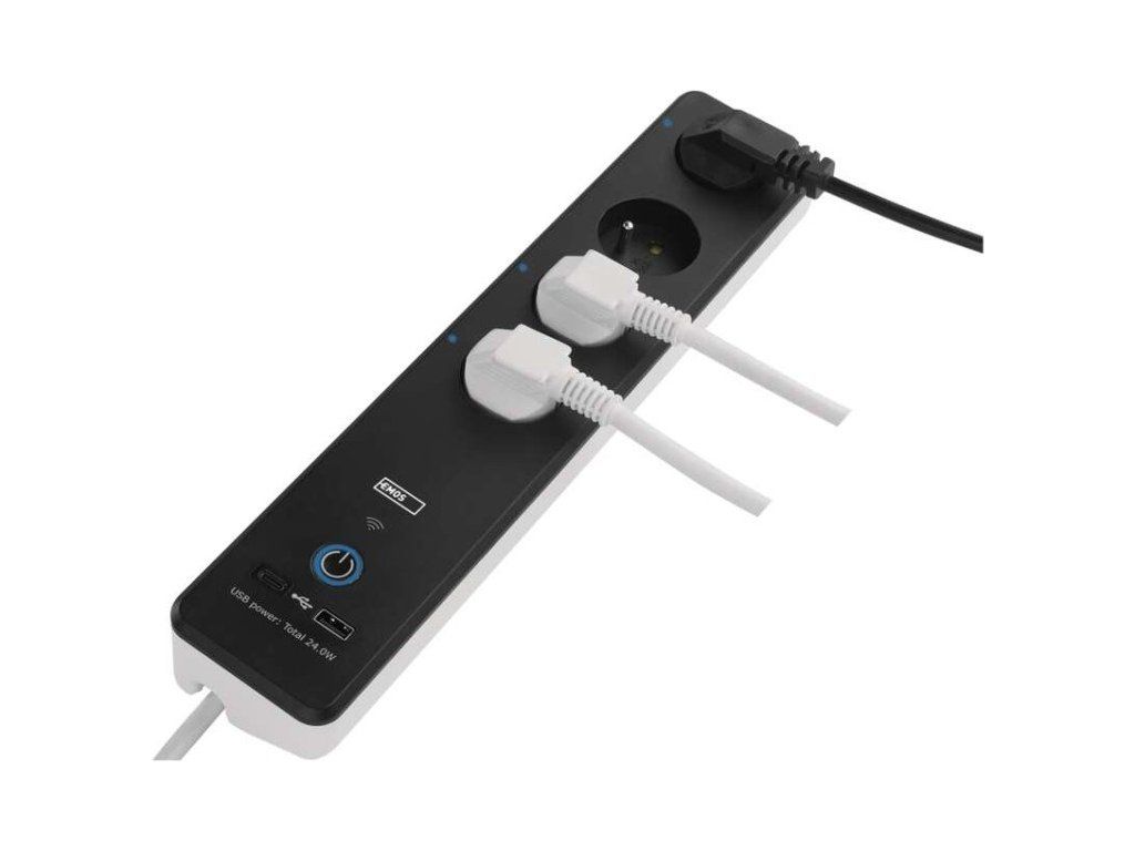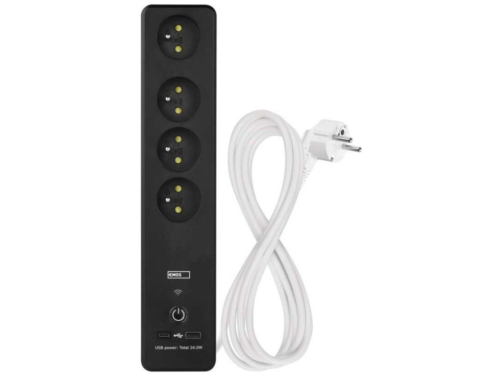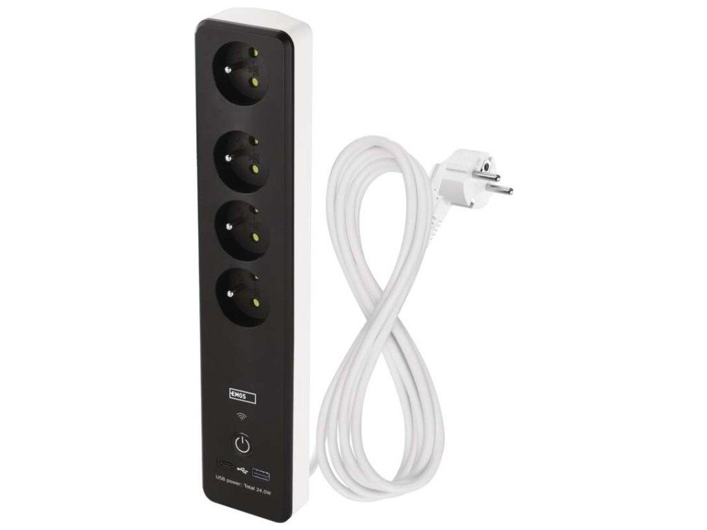 SMART prodlužovací přívod - Wi-Fi. 4 zásuvky + 2 USB výstupy. Přenosová frekvence: 2,4 GHz. Wi-Fi standard IEEE 802.11 b/g/n. Bezpečnostní mechanismy: OPEN/WEP/WPA-PSK/WPA2-PSK. USB výstup typ A + typ C: 5 V DC Max. 4,8 A, Max. 24 W. Platforma TUYA - EMOS GoSMART.Možnost ovládání každé zásuvky přes aplikaci EMOS GoSMART. Funkce měřič spotřeby pro zásuvky 230 V. Funkce časovače pro každou zásuvku 230 V. Možnost manuálního vypnutí a zapnutí všech zásuvek.