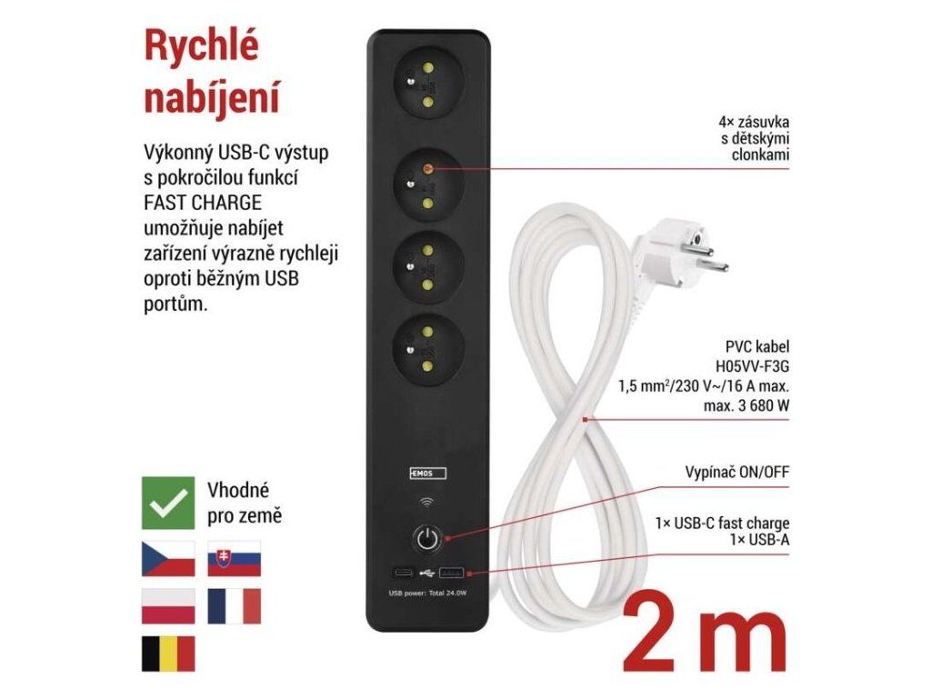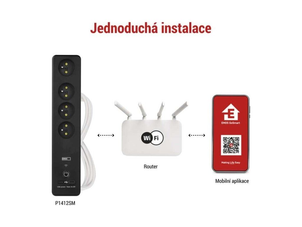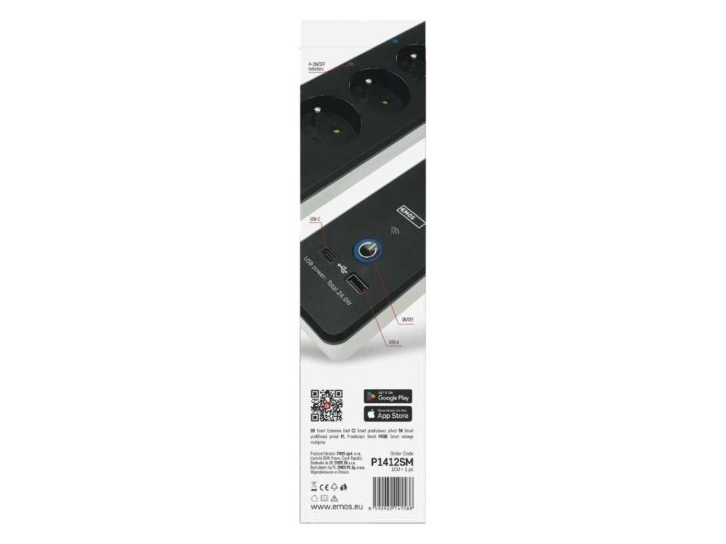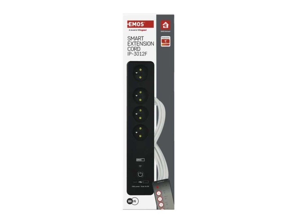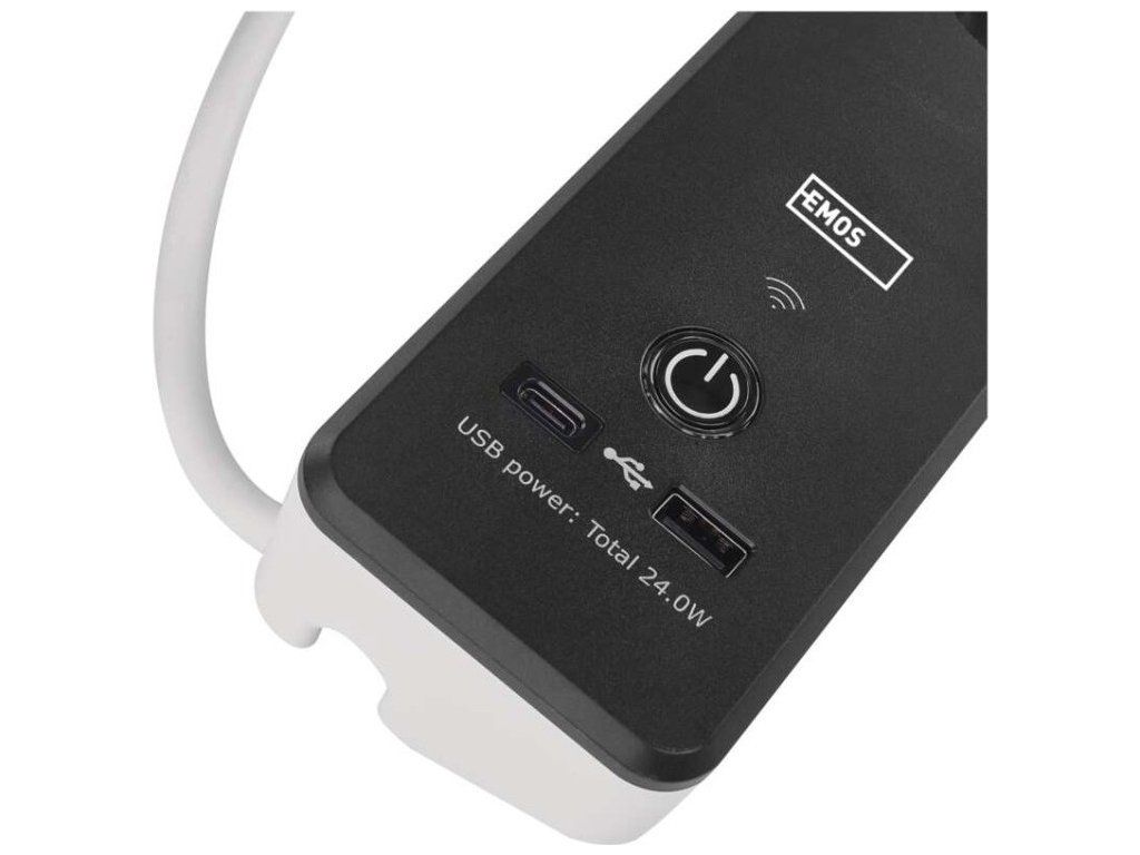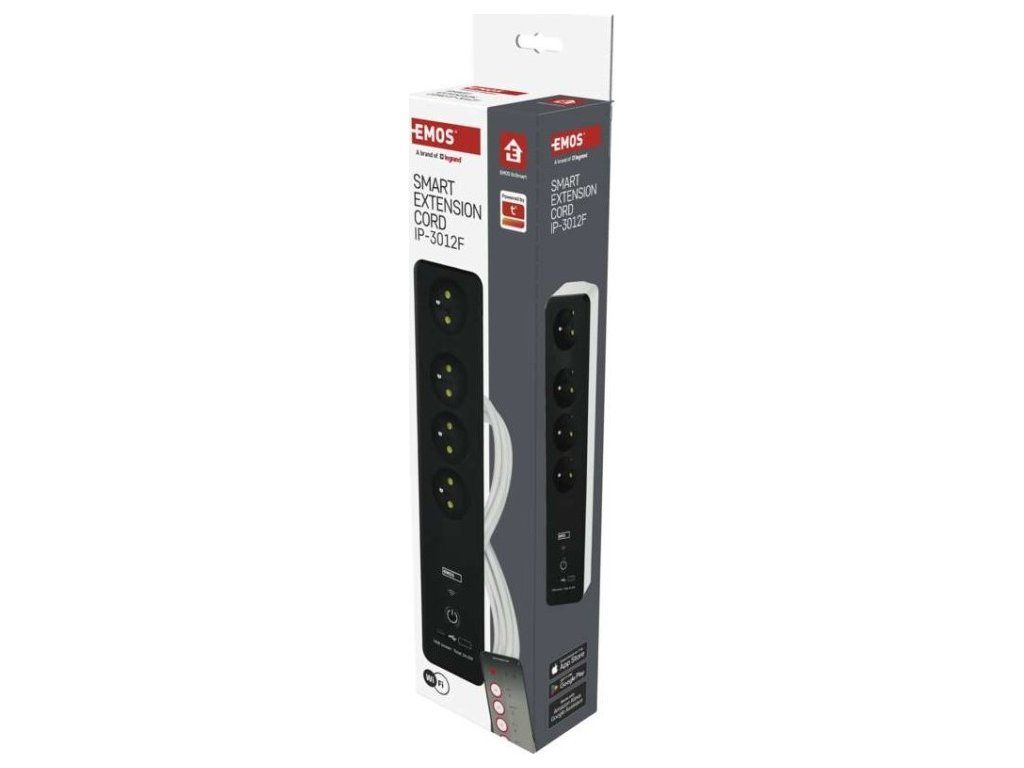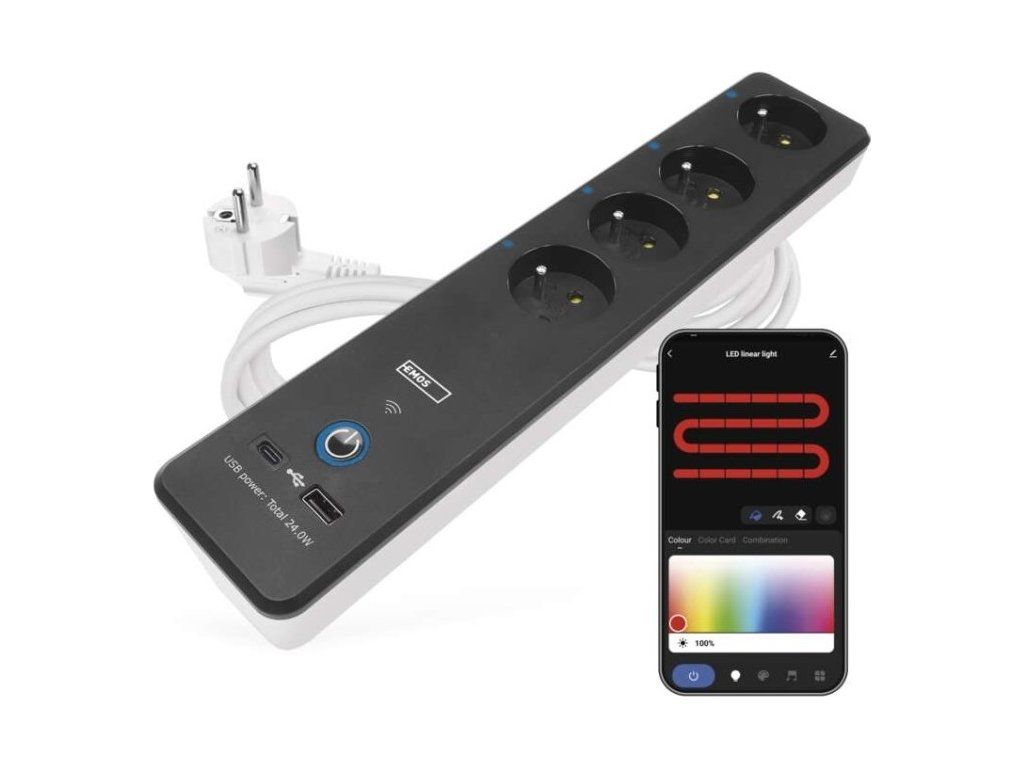 SMART prodlužovací přívod - Wi-Fi. 4 zásuvky + 2 USB výstupy. Přenosová frekvence: 2,4 GHz. Wi-Fi standard IEEE 802.11 b/g/n. Bezpečnostní mechanismy: OPEN/WEP/WPA-PSK/WPA2-PSK. USB výstup typ A + typ C: 5 V DC Max. 4,8 A, Max. 24 W. Platforma TUYA - EMOS GoSMART.Možnost ovládání každé zásuvky přes aplikaci EMOS GoSMART. Funkce měřič spotřeby pro zásuvky 230 V. Funkce časovače pro každou zásuvku 230 V. Možnost manuálního vypnutí a zapnutí všech zásuvek.