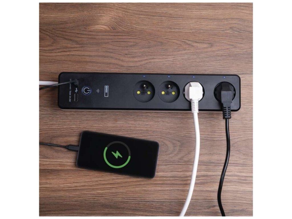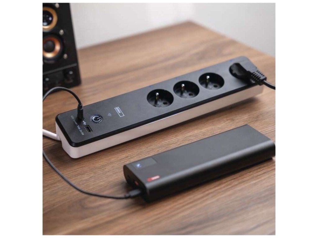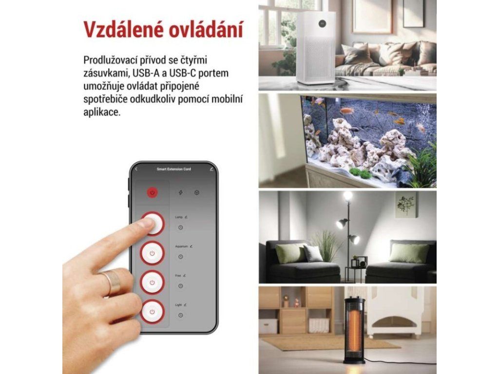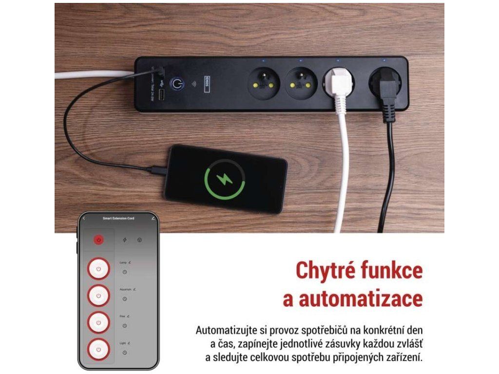 4 zásuvky + 2 USB porty 1x USB typ A a 1x USB typ C - QC 3.0. Vzdálené ovládání přes Wi-Fi. Měření spotřeby. Časovač.