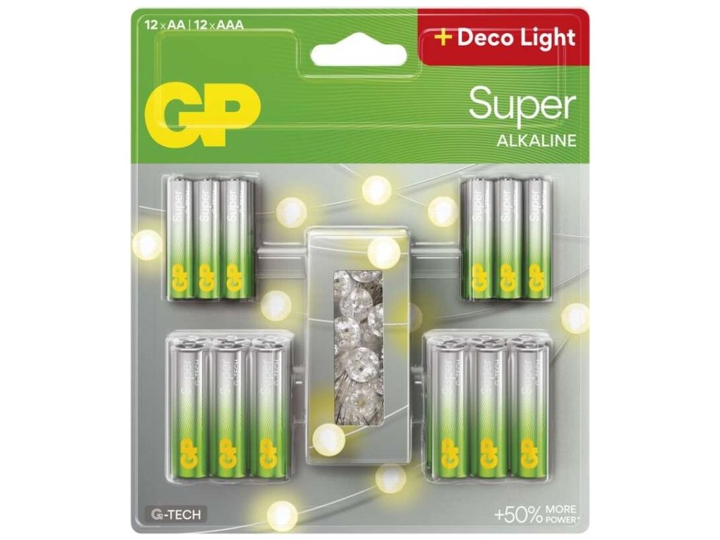 GP alkalická baterie SUPER AA 12 + AAA 12 + LED řetěz BL