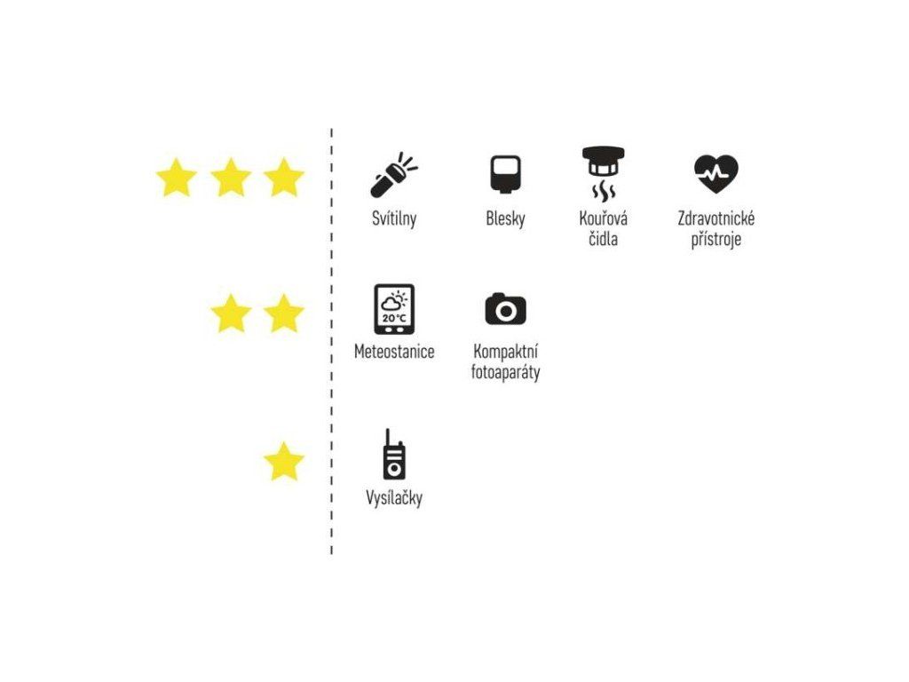 - Vhodná pro digitální fotoaparáty a blesky, elektronické hračky, zdravotnické pomůcky a přístroje, hobby modely, přehrávače MP3, PDA a příruční GPS.