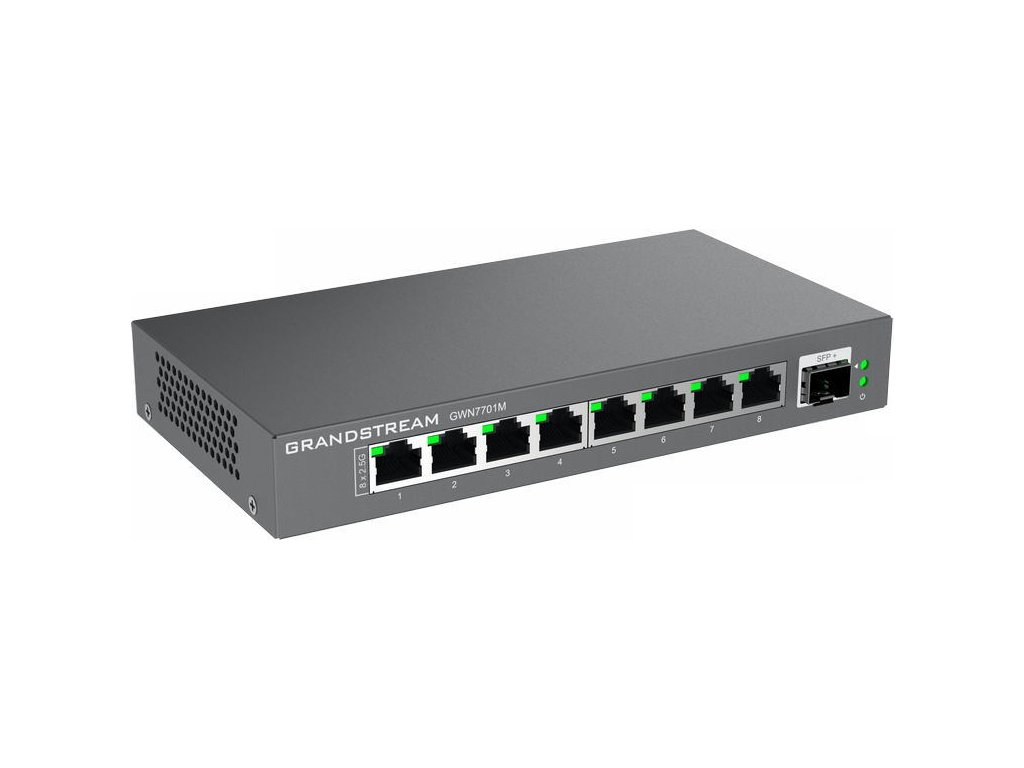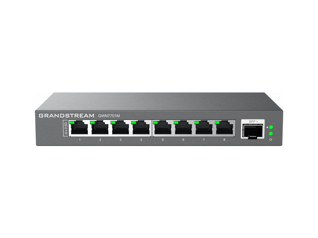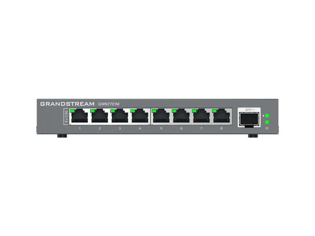 GWN7701M je unmanaged multi-Gigabit síťový switch, které poskytuje vysokorychlostní síťové připojení až 2,5 Gb/s pro home office a malé a střední firmy. Tento 8 portový multigigabitový switch podporuje rychlý Ethernet, 1-Gigabit a 2.5-Gigabit síťové rychlosti a zároveň obdsahuje 1 SFP+ Gigabit port, který poskytuje 1-Gigabit nebo 10-Gigabit vysokorychlostní uplinkové připojení k vaší síti.