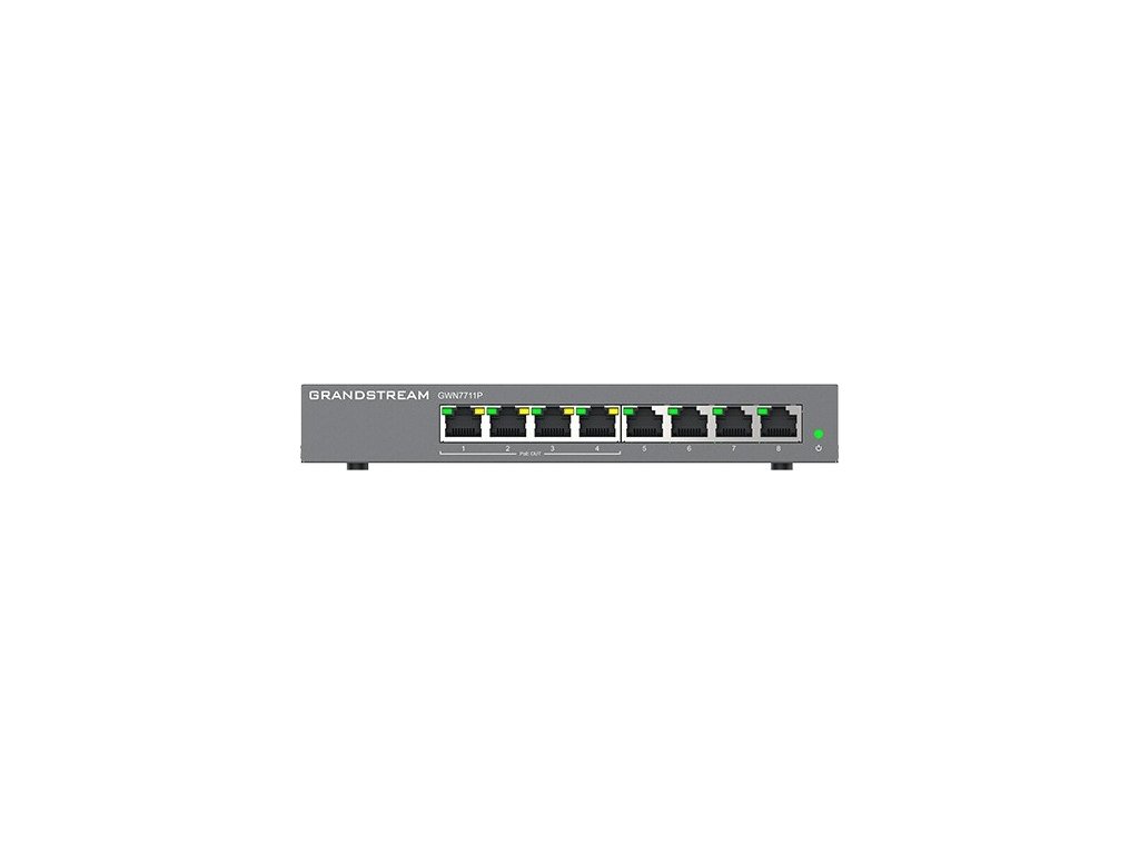 GWN7711P podporuje VLAN pro flexibilní a sofistikovanou segmentaci provozu, QoS pro upřednostňování síťového provozu, IGMP Snooping pro optimalizaci výkonu sítě a komplexní možnosti zabezpečení proti potenciálním útokům. GWN7711P lze snadno spravovat prostřednictvím místního webového uživatelského rozhraní a cloudu pomocí systému správy zařízení Grandstream (GDMS). Díky komplexní sadě přizpůsobitelných přepínacích funkcí, dostupnému pasivnímu PoE režimu 24V DC a snadné správě cloudu jsou řady GWN7711(P) ideálními spravovanými síťovými přepínači pro malá až středně velká nasazení. GWN7711P poskytuje 4 porty PoE pro inteligentní dynamický výstup PoE pro napájení IP telefonů, IP kamer, přístupových bodů Wi-Fi a dalších koncových bodů PoE. Tento model s podporou PoE může také podporovat 24V DC pasivní režim PoE-out.