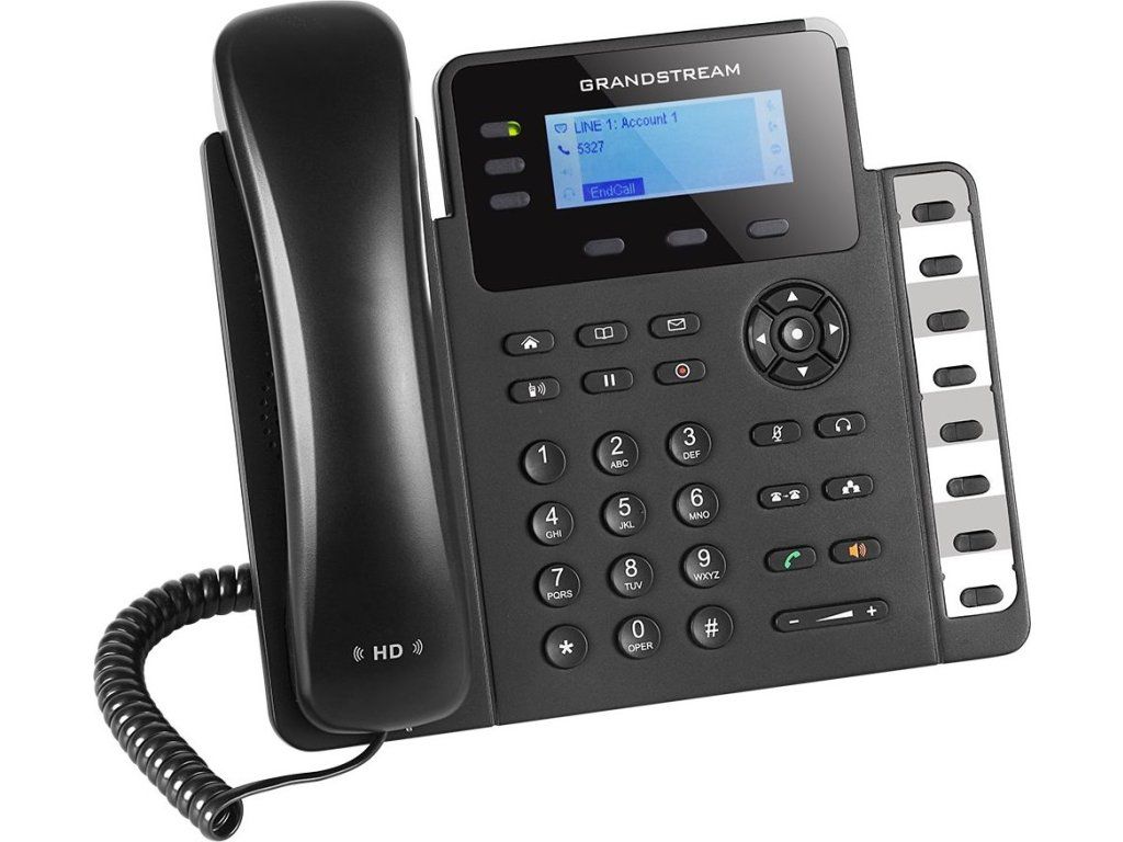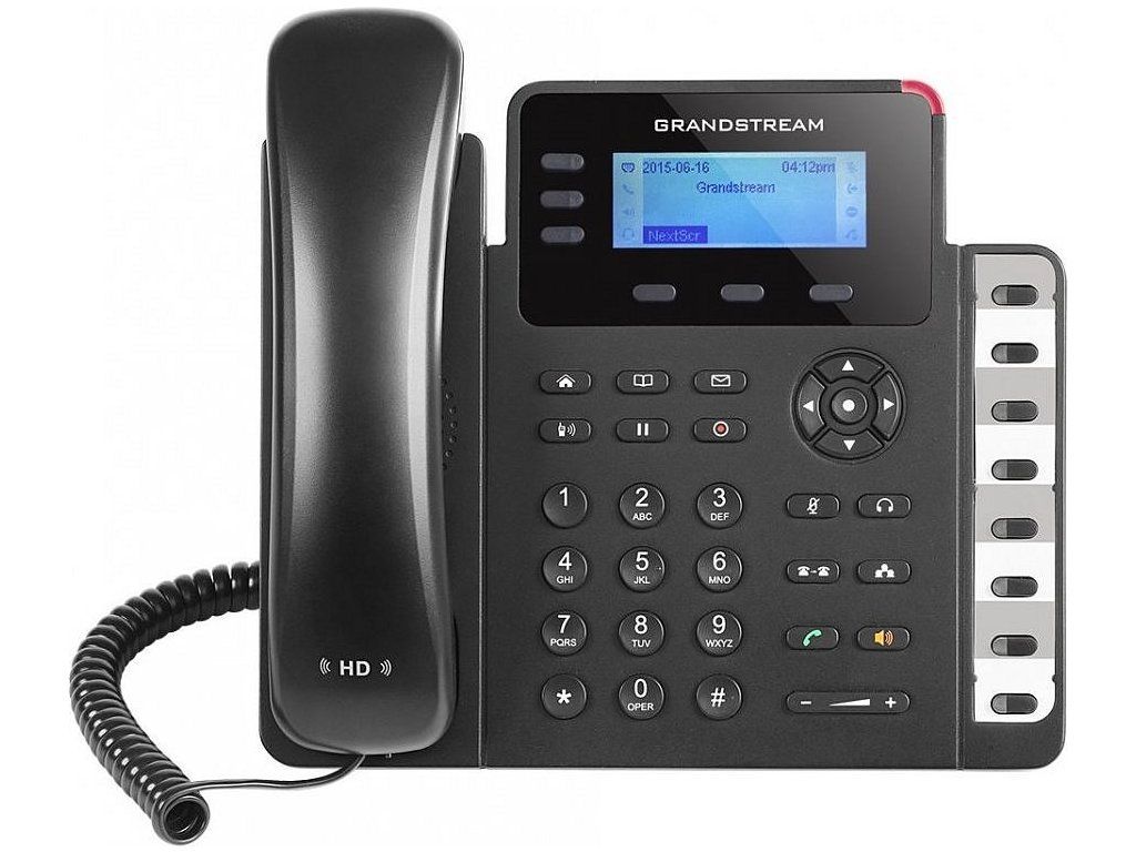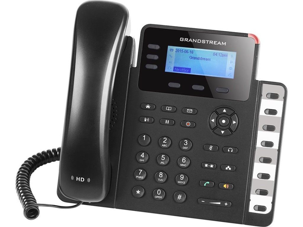 GXP160 disponuje 3 SIP účty, 3 programovatelnými tlačítky, 8 BLF tlačítky s dvojbarevnou LED indikací stavu klapky a možností až 4 cestné audio konference.
