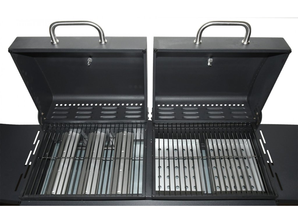 Konstrukce je vyrobena z kvalitní oceli s odolným černým povrchem. Madla z nerezi mají dostatečný prostor pro úchop a zvyšují eleganci grilu. Gril je opatřen kolečky z odolného plastu pro zajištění dostatečné pohyblivosti. Víka grilu jsou opatřena teploměry a boky grilovacích prostorů jsou doplněny regulovatelnou ventilací.