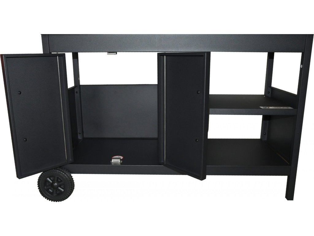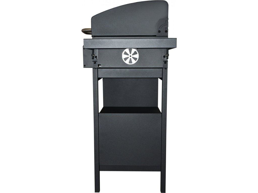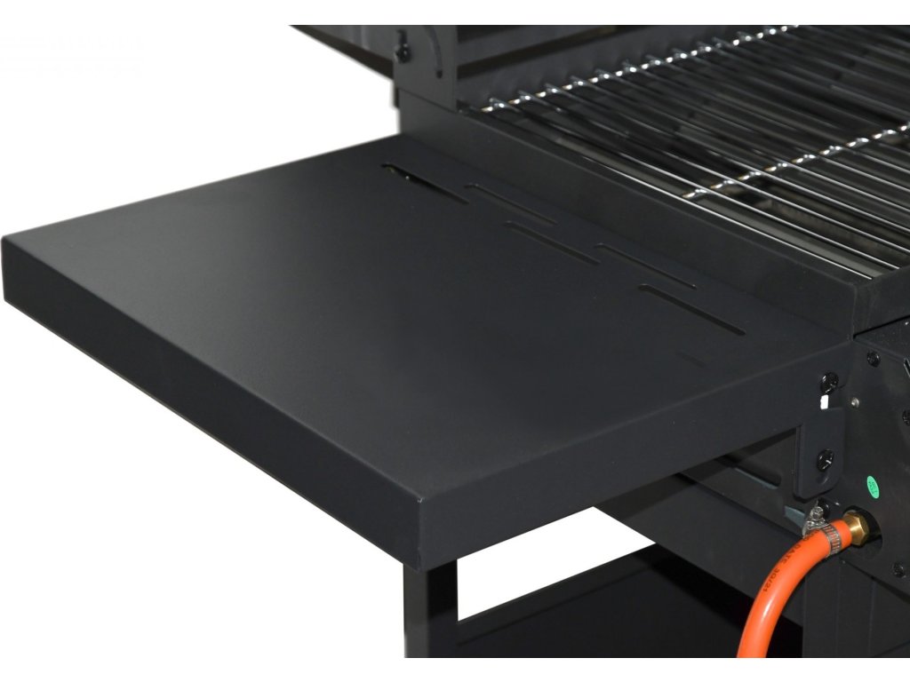 Odkládací prostor tvoří skříňka s rozměry 46 x 47 cm opatřená dvířky v části pod plynovým grilem, 2x patrová polička v části pod grilem na uhlí a skládací poličky na bocích grilu s rozměry 39 x 28 cm.
