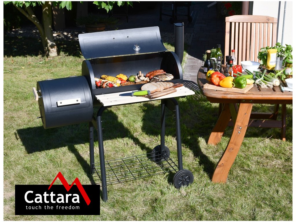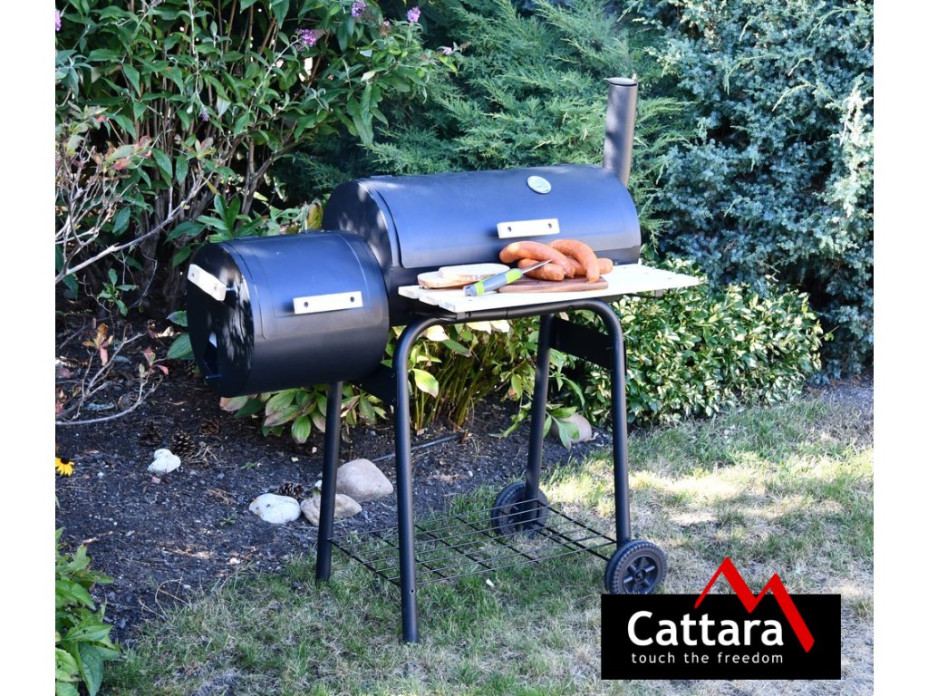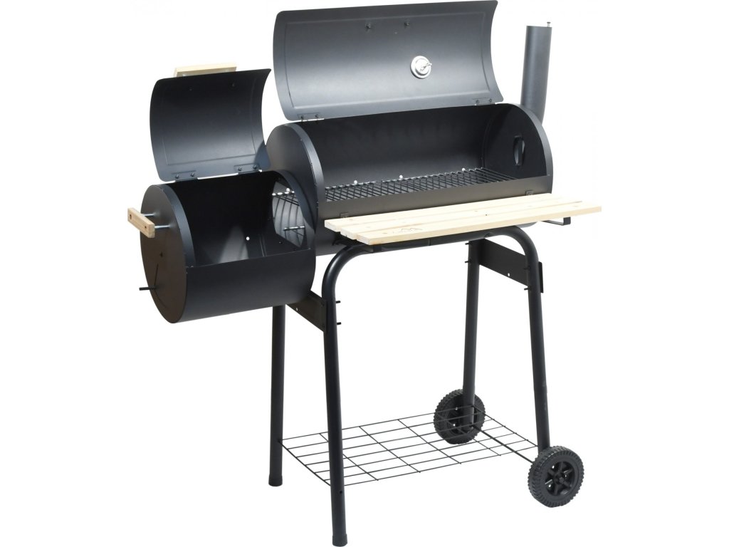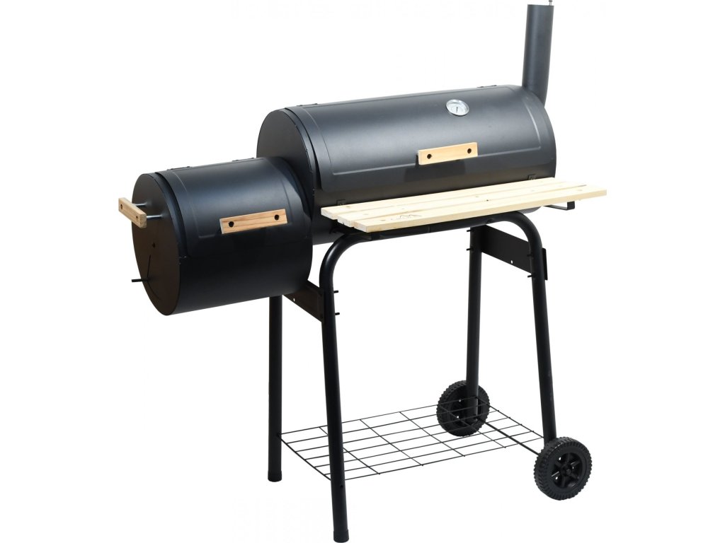 Zahradní gril s udírnou, na dřevěné uhlí s konstrukcí typu lokomotiva.