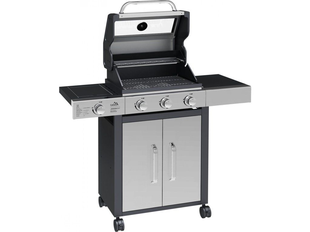 Plynový zahradní gril se systémem Flame Tamer - nevyžaduje lávové kameny. Trojitý hlavní a jeden boční nerezový hořák s piezo zapalováním a plynulou regulací.