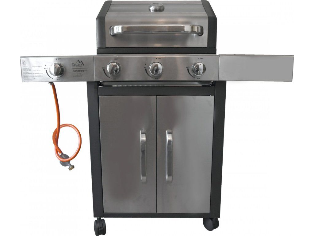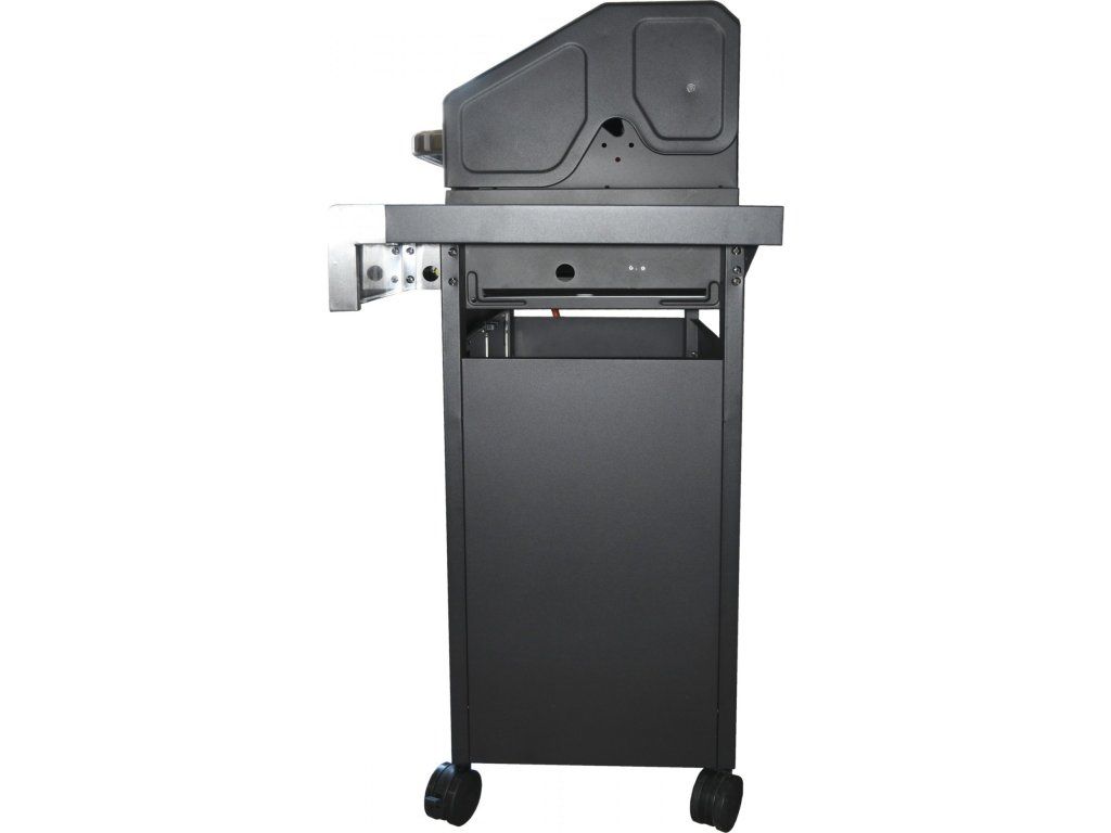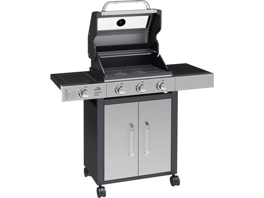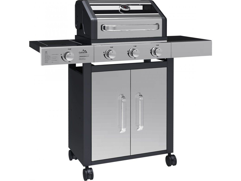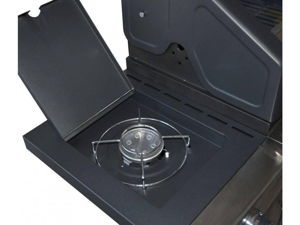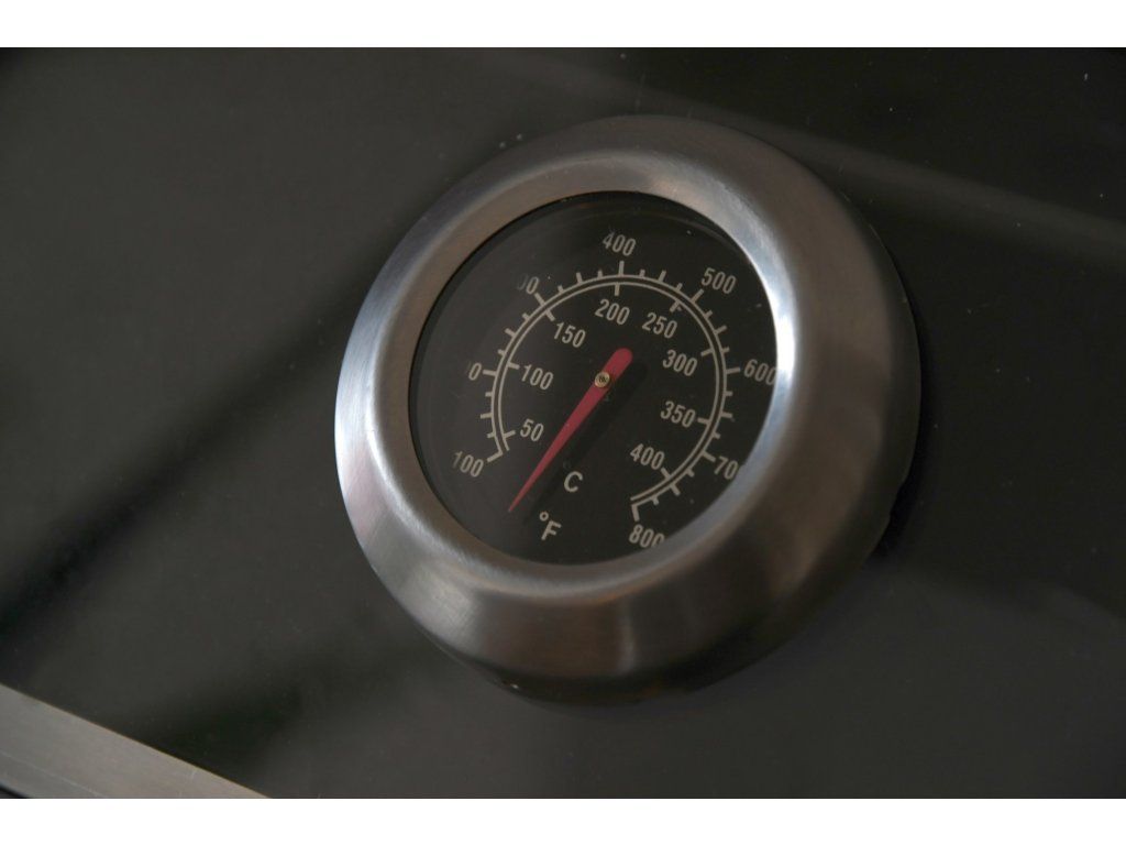 Sklopné víko grilu je opatřeno průzorem, díky kterému je možné sledovat stav grilovaných pokrmů bez otevírání grilu. Gril je vybaven odkládacími poličkami na obou stranách, z nichž jedna je doplněna o boční vařič. Součástí je i spojovací hadice k plynové lahvi a redukční ventil.