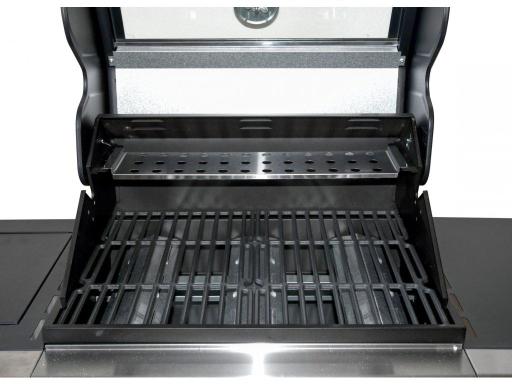 Manipulace s grilem je usnadněná díky 4 kolečkům. Jednotlivé prvky z leštěné oceli jsou pohodlné na úchop. Spodní část grilu je doplněna o praktickou skříňku s rozměry 53 x 68 cm opatřenou dvířky.