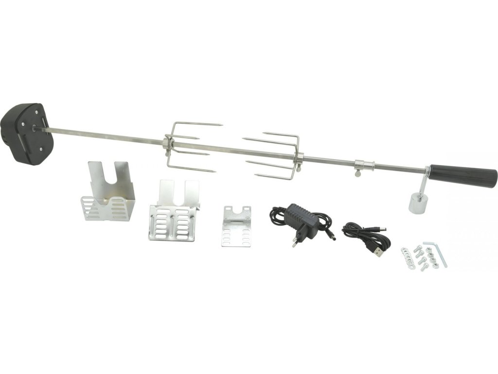Motor disponuje rychlostí 3 otáčky za minutu, čímž zajišťuje rovnoměrné grilování kuřat, špízů a různých bloků masa, postupně ze všech stran. Motor lze napájet ze standardní zásuvky 230 V, nebo pomocí USB kabelu (5V) například z powerbanky.
