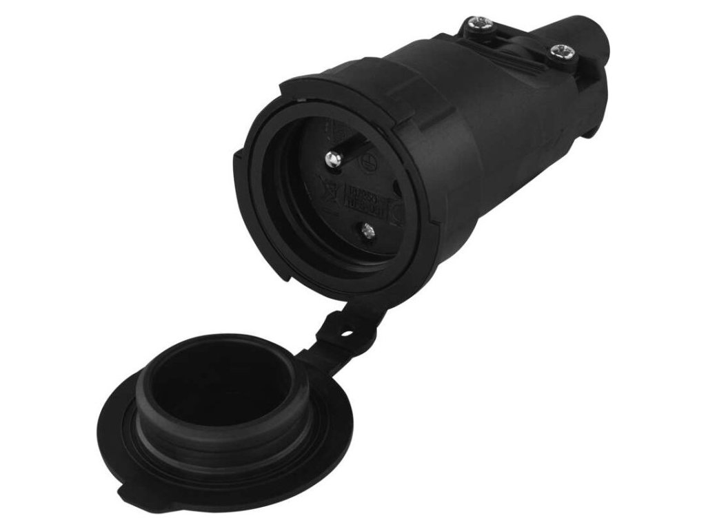 Gumová zásuvka pro pohyblivý prodlužovací přívod. Je určena k připojení elektrických zařízení kde je vyžadován vyšší stupeň krytí (i v exteriéru).
