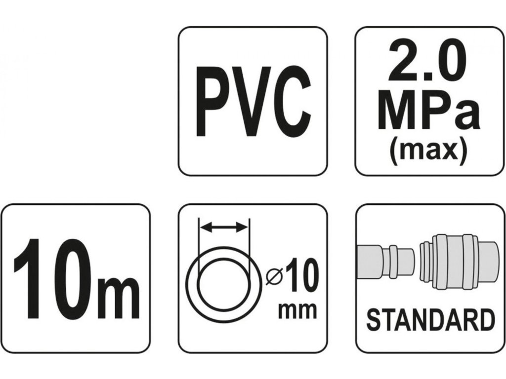 Profesionální vzduchová hadice s délkou 10 m zakončená rychlospojkami.
