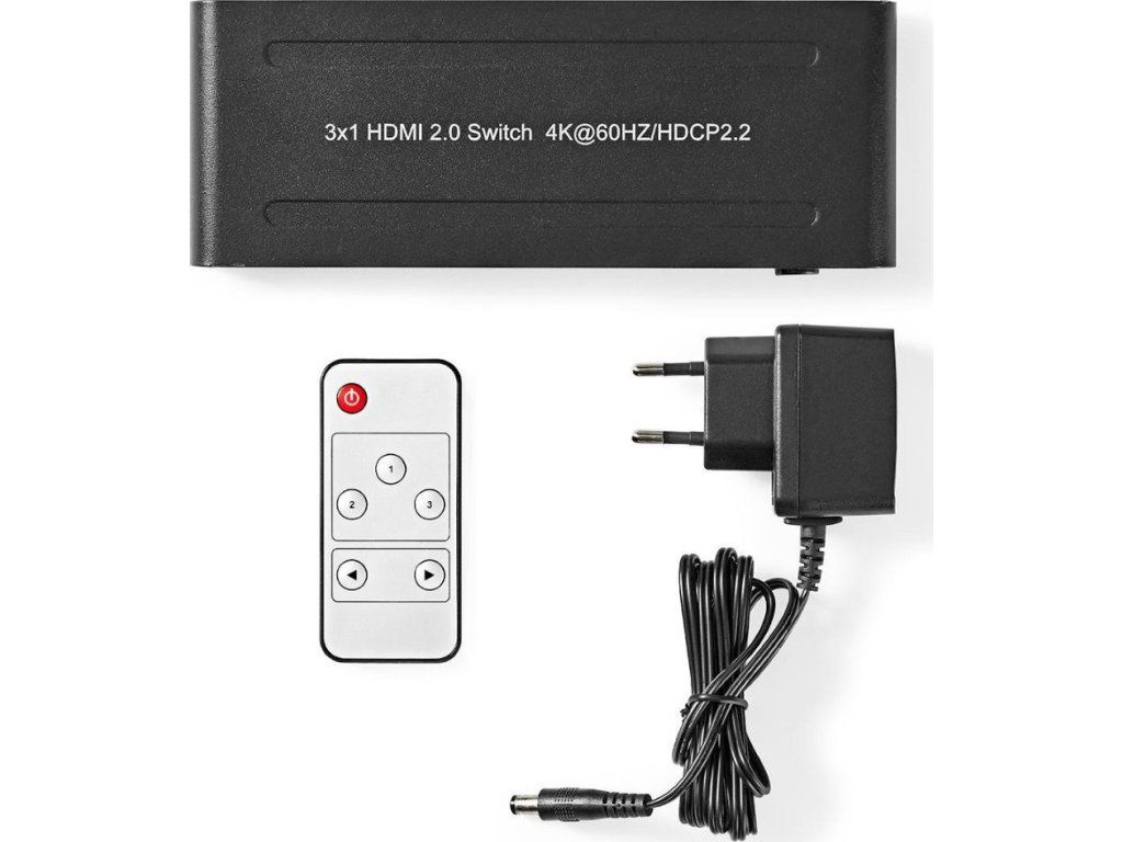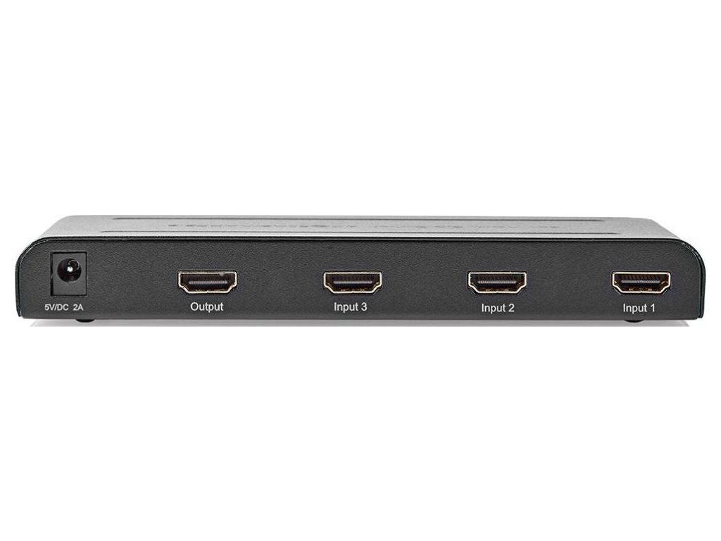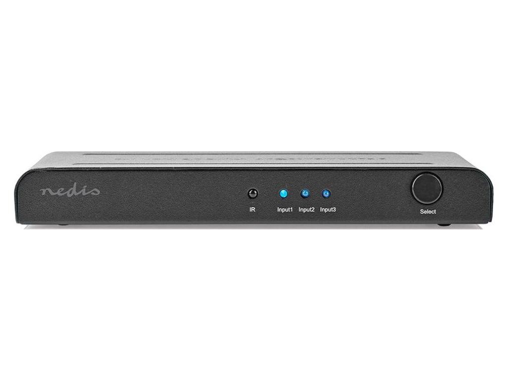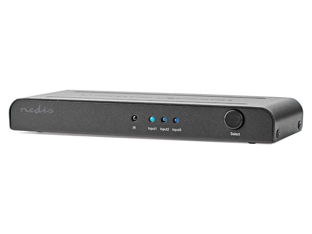 Nedis VSWI3473ATHDMI switch/přepínač 3 : 1 umožňuje, aby tři HDMI zařízení sdílela jediné HDMI výstupní zařízení (obrazovku). Výběr zdroje probíhá stiskem tlačítka nebo pomocí dálkového ovládání. Zařízení podporuje datový tok 18 Gbps, 4K Ultra HD rozlišení, 3D obraz a technologii HDCP 2.2. Současně také zesiluje HDMI signál. K napájení slouží přiložený napájecí adaptér.